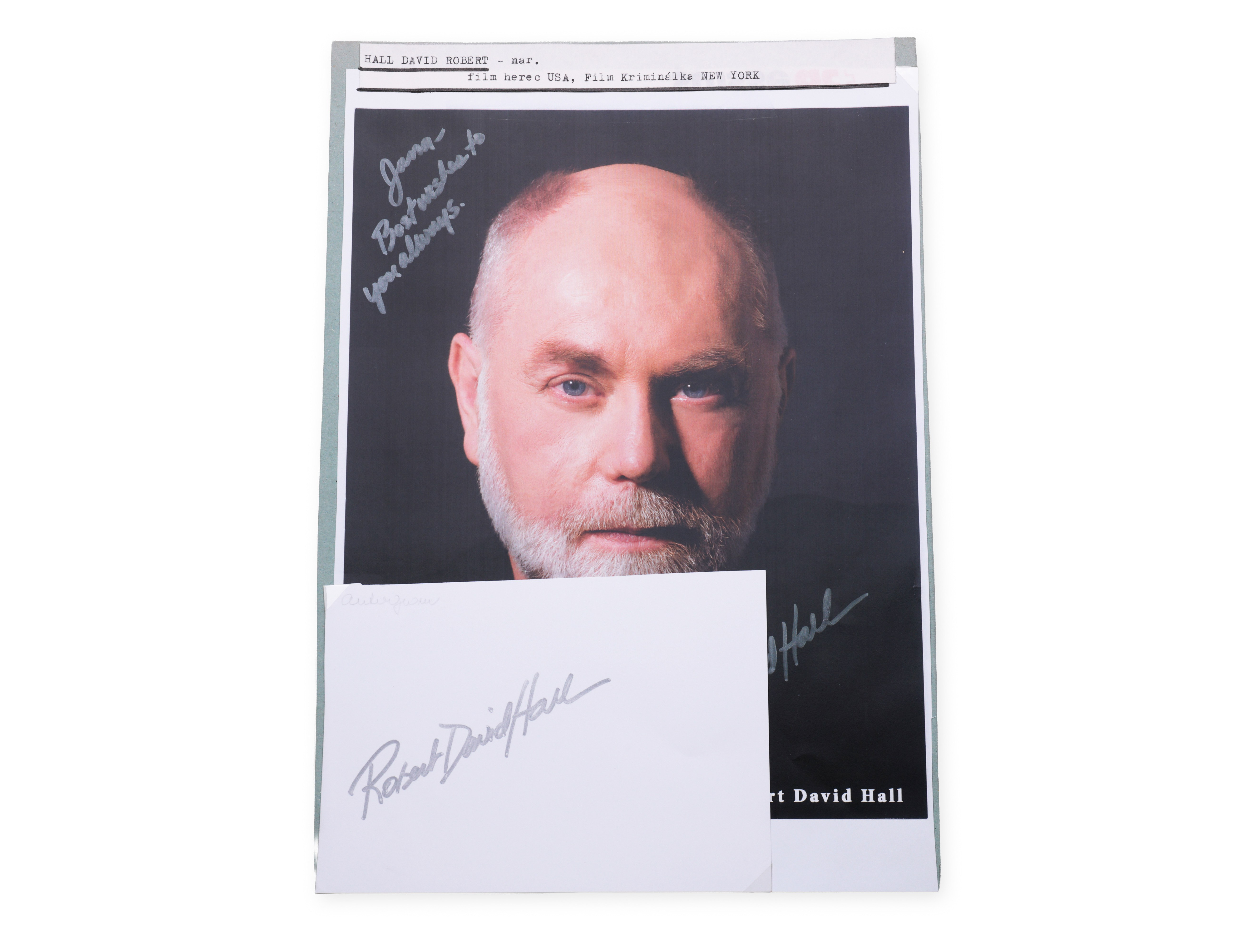 Signature of David Robert Hall on photograph and card placed on collector's sheet. David Robert Hall is an actor best known for his role as Dr. Al Robbins in the popular television series "CSI: Crime Scene Investigation." His signature is an interesting collector's item associated with a prominent character in modern television crime fiction.