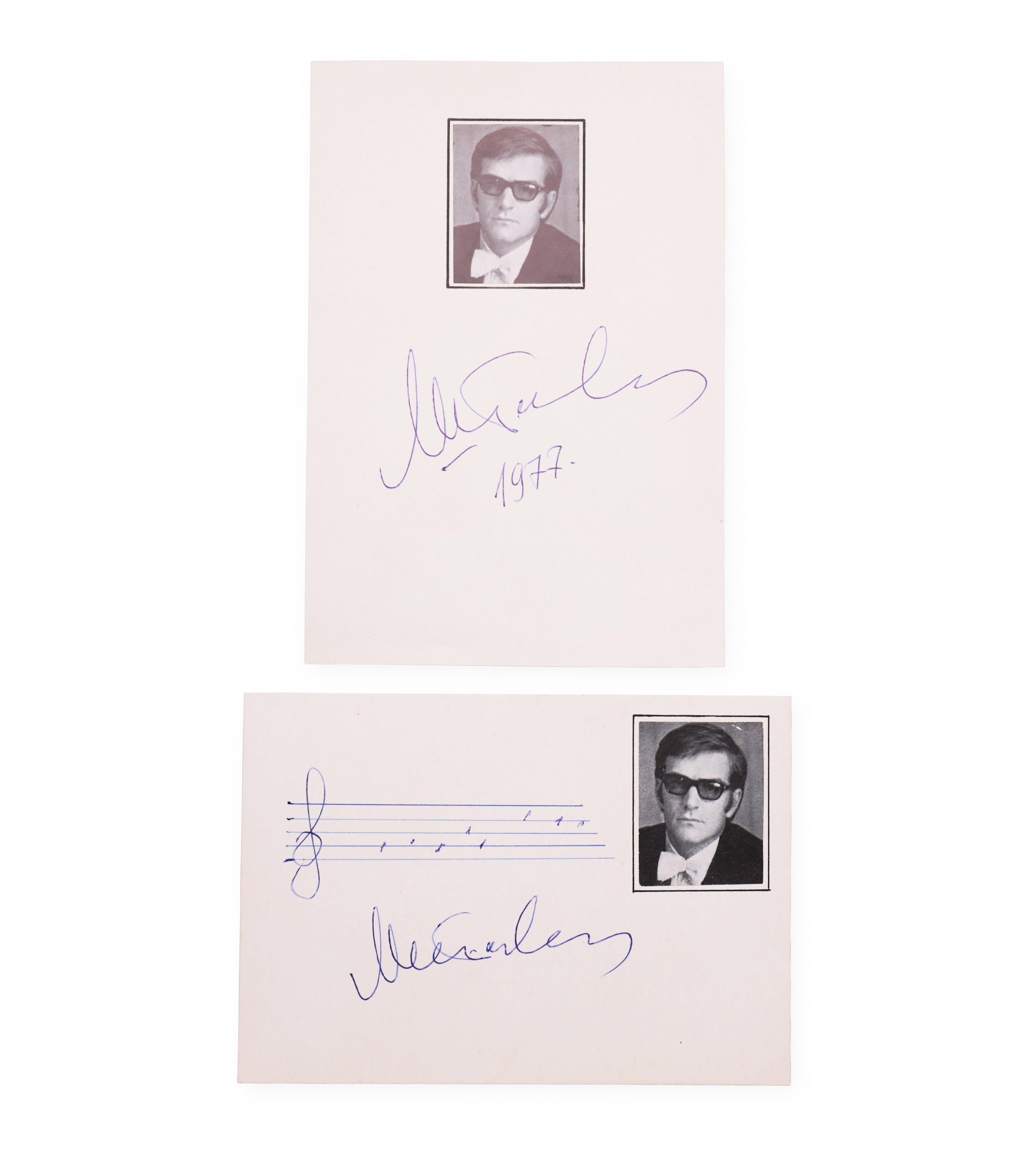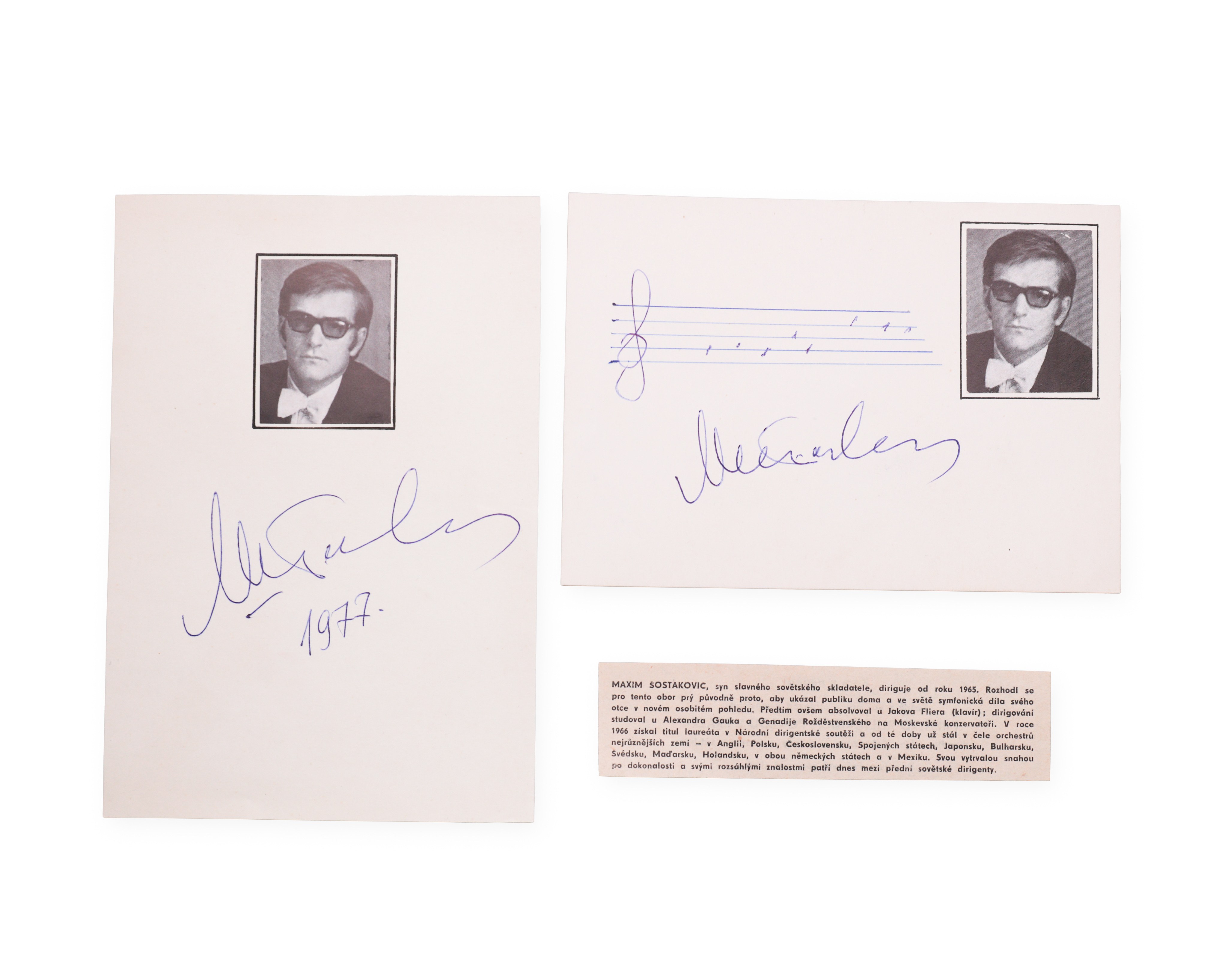 One signed autograph card of Maxim Dmitrievich Shostakovich with handwritten notation, the other card only with signature without notation, supplemented with an informative newspaper clipping, dated 1977. Maxim Dmitrievich Shostakovich was a Russian conductor, pianist and son of the famous composer Dmitri Shostakovich. During his career, he mainly devoted himself to the interpretation and dissemination of his father's work, but he was also active as an artistic director and promoter of Russian symphonic music. The collection represents a personal and artistic imprint of his work in the cultural environment of the late Soviet Union.