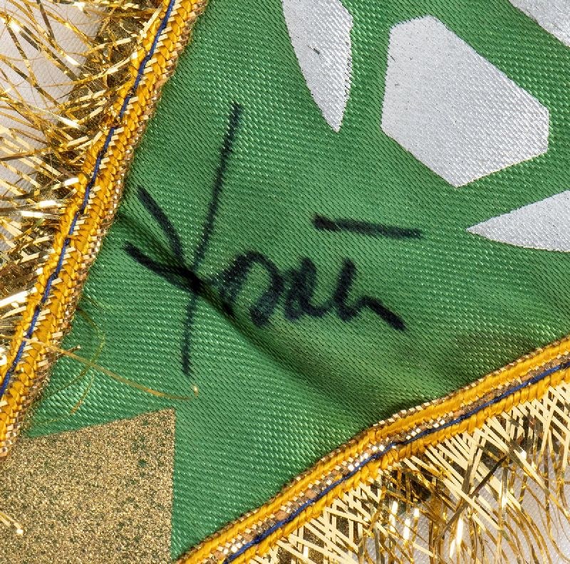 Original pennant for the Mexico 70 World Cup with autographs of the Italian footballers. Image of the Rimet Cup and the writing IX CAMPEONATO MUNDIAL DE FUTBOL. The autographs are original, handwritten by the players of the Italian national team. We recognize De Sisti, Rivera, and others. Complete with rod. In mediocre condition, the signatures are heavily faded
