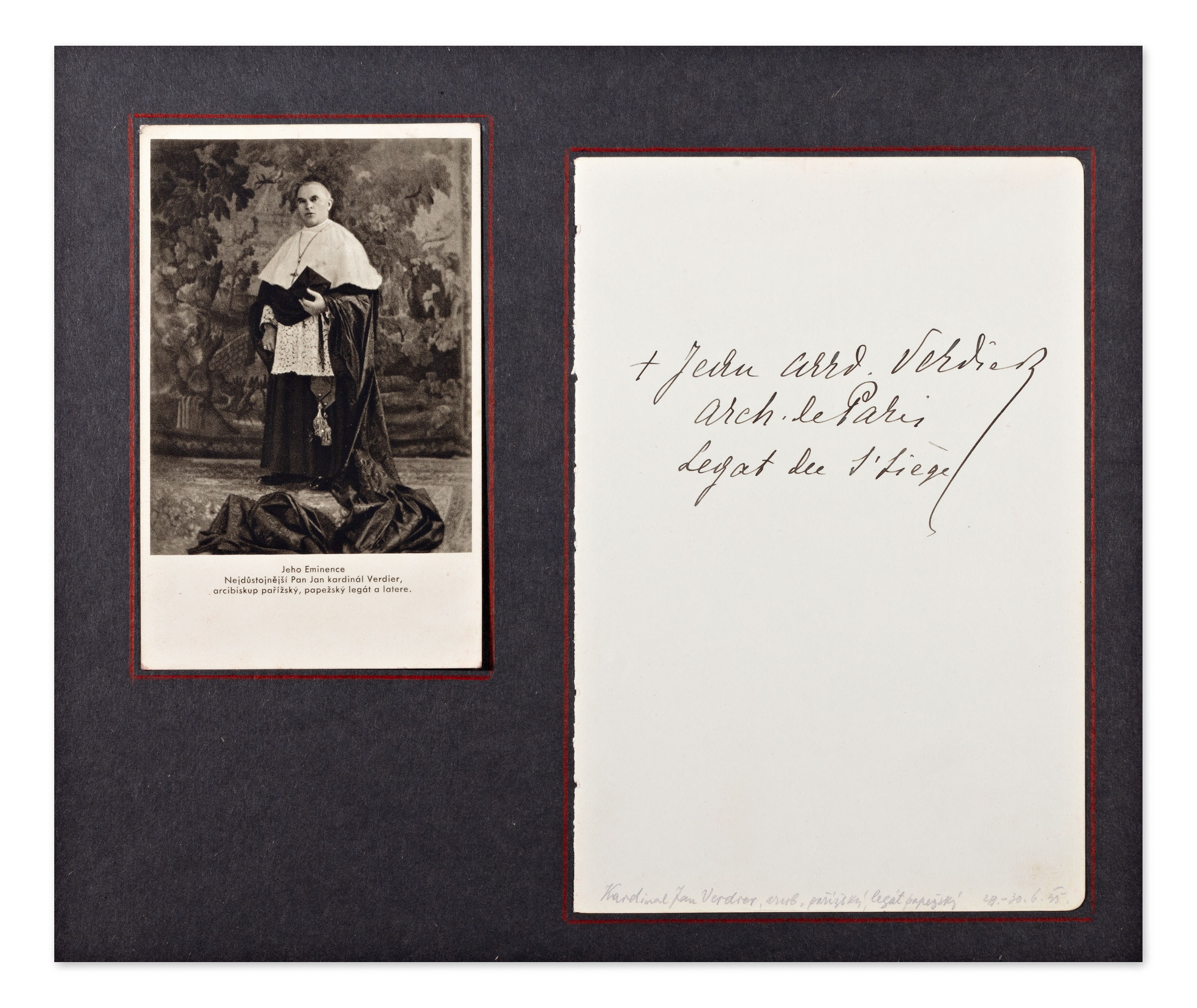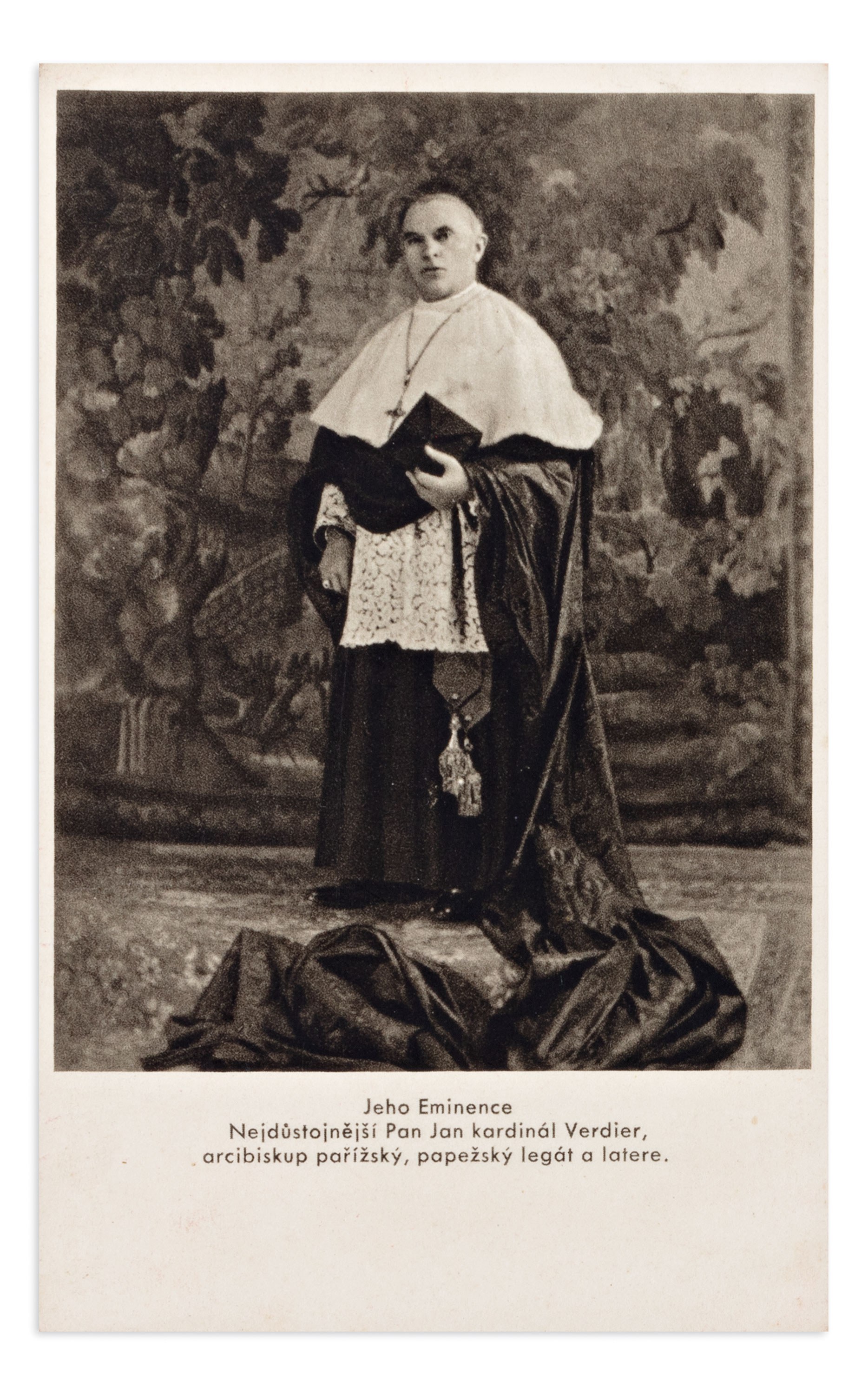 Text at the bottom of the photograph: "Kardinál Jean Verdier, arcibiskup, legát Svatého stolce."