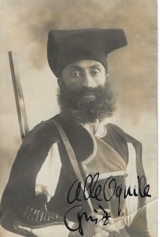 Original autographed black and white photo of Guido Keller in Sardinian costume (?) with dedication "ALLE AQUILE - GUIDO"Guido Keller (Milan, February 6, 1892 – Otricoli, November 9, 1929), an Italian aviator, took part in the First World War and was one of the participants in the Fiume Expedition led by Gabriele D'Annunzio. An eclectic and extravagant character, as demonstrated by this unique and extremely rare photograph.Autograph dedication and signature, in black ink.The photo measures approximately 9 x 13.5 cm, with a crease at the right corner that does not deface or damage the dedication and signature.
