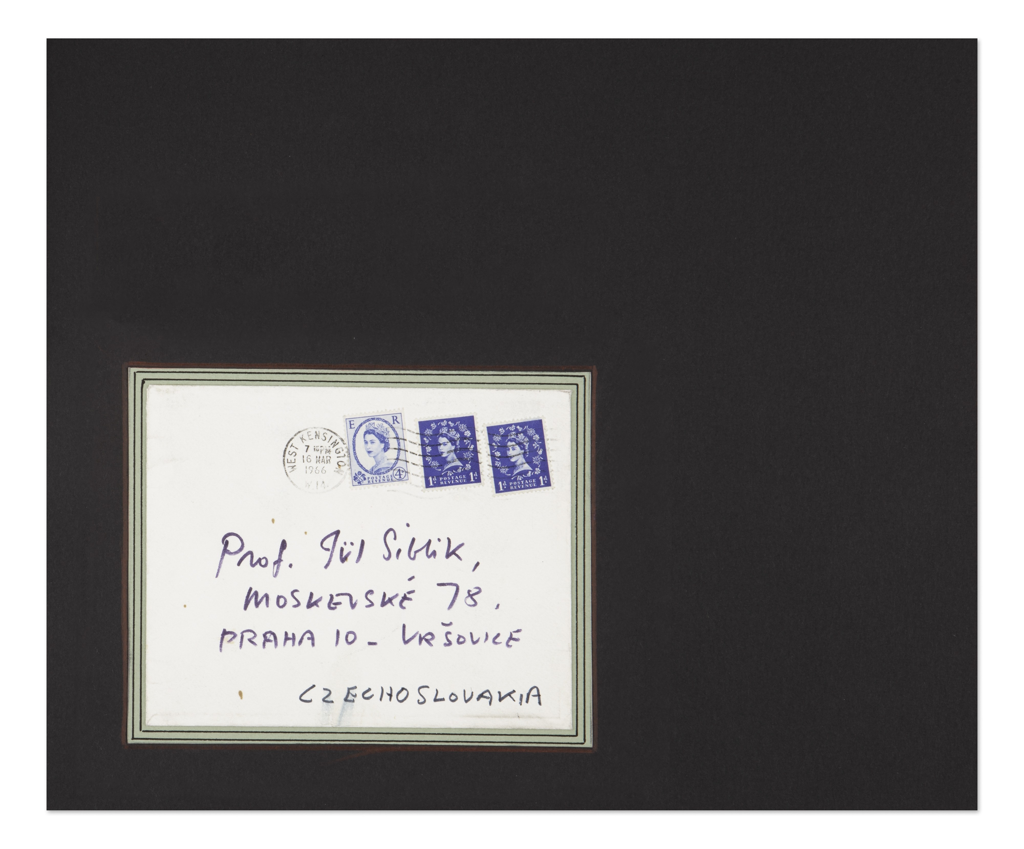 This envelope contains a handwritten address written by Kenneth Armitage, a British sculptor, on an envelope that was sent on March 16, 1966. The address is written in blue ink and is addressed to Professor J. Siblík in Prague: "Prof. Jiří Siblík, Moskevská 78, Praha 10 - Vršovice CZECHOSLOVAKIA" The envelope features three British postage stamps, in blue with a portrait Queen Elizabeth IIBidders are obliged to inform themselves about the condition of the lots before the auction, subsequent complaints will not be taken into account.