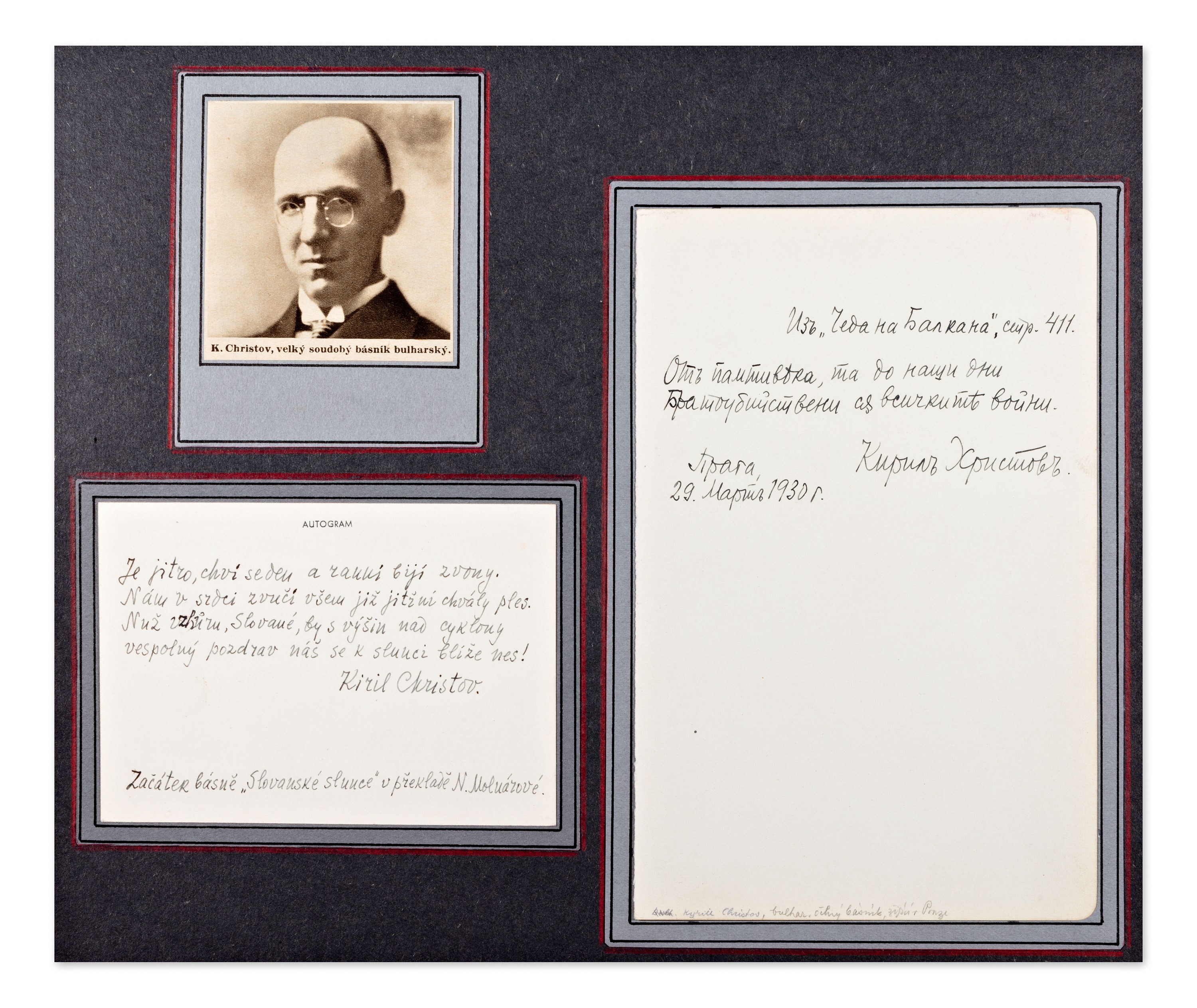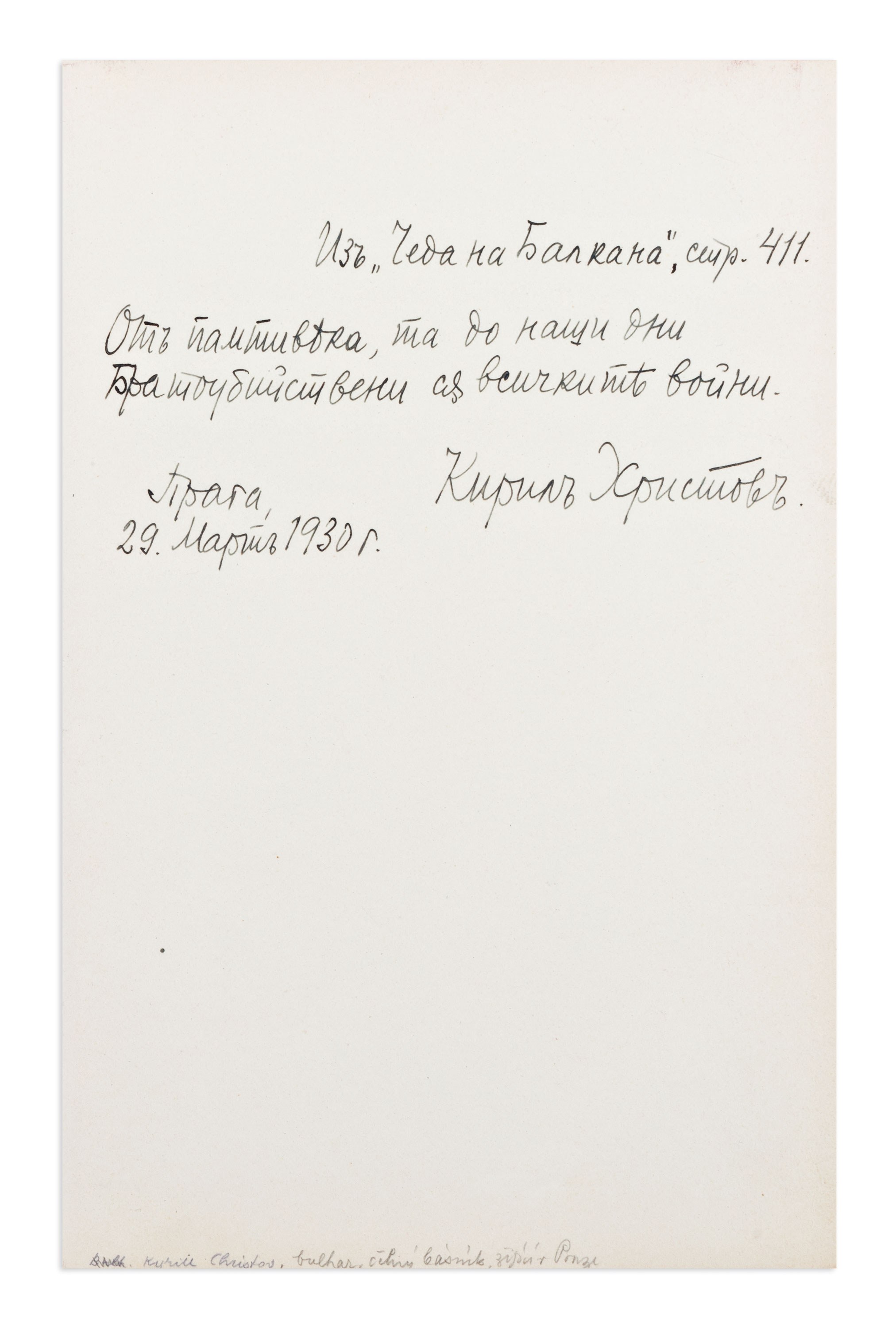 "From memory to our days, all wars are fratricidal. Prague, March 29, 1930. Kiril Christov"