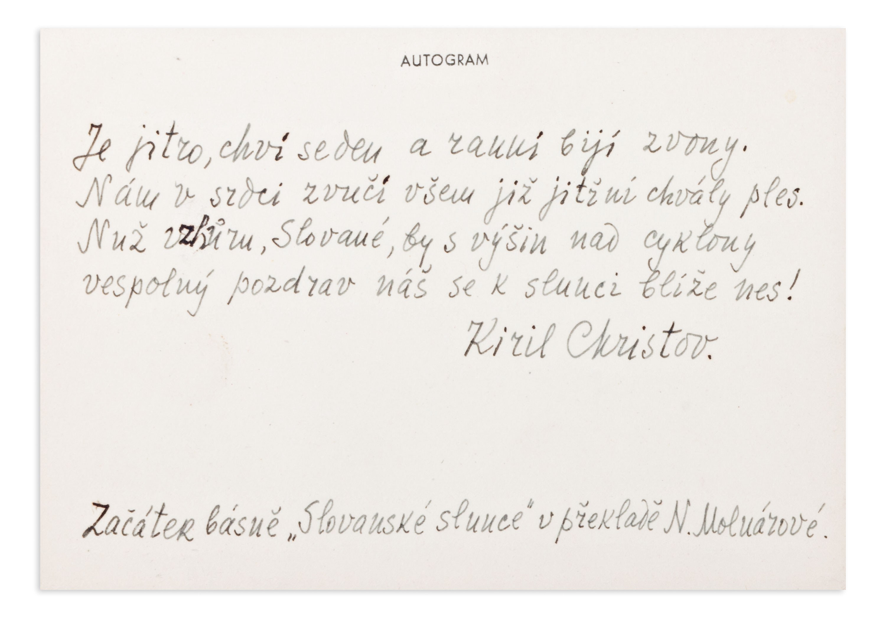 Two handwritten texts:Beginning of the poem Slovanské slunce (Slavic Sun) translated by N. Melanová: