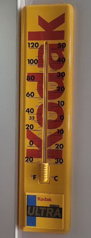 KODAK promotional thermometer for Kodak Gold Ultra film. Made of plastic, single-sided, with a working thermometer, in perfect condition, with no damage or repairs.It measures approximately 100 cm high by 24 cm wide.