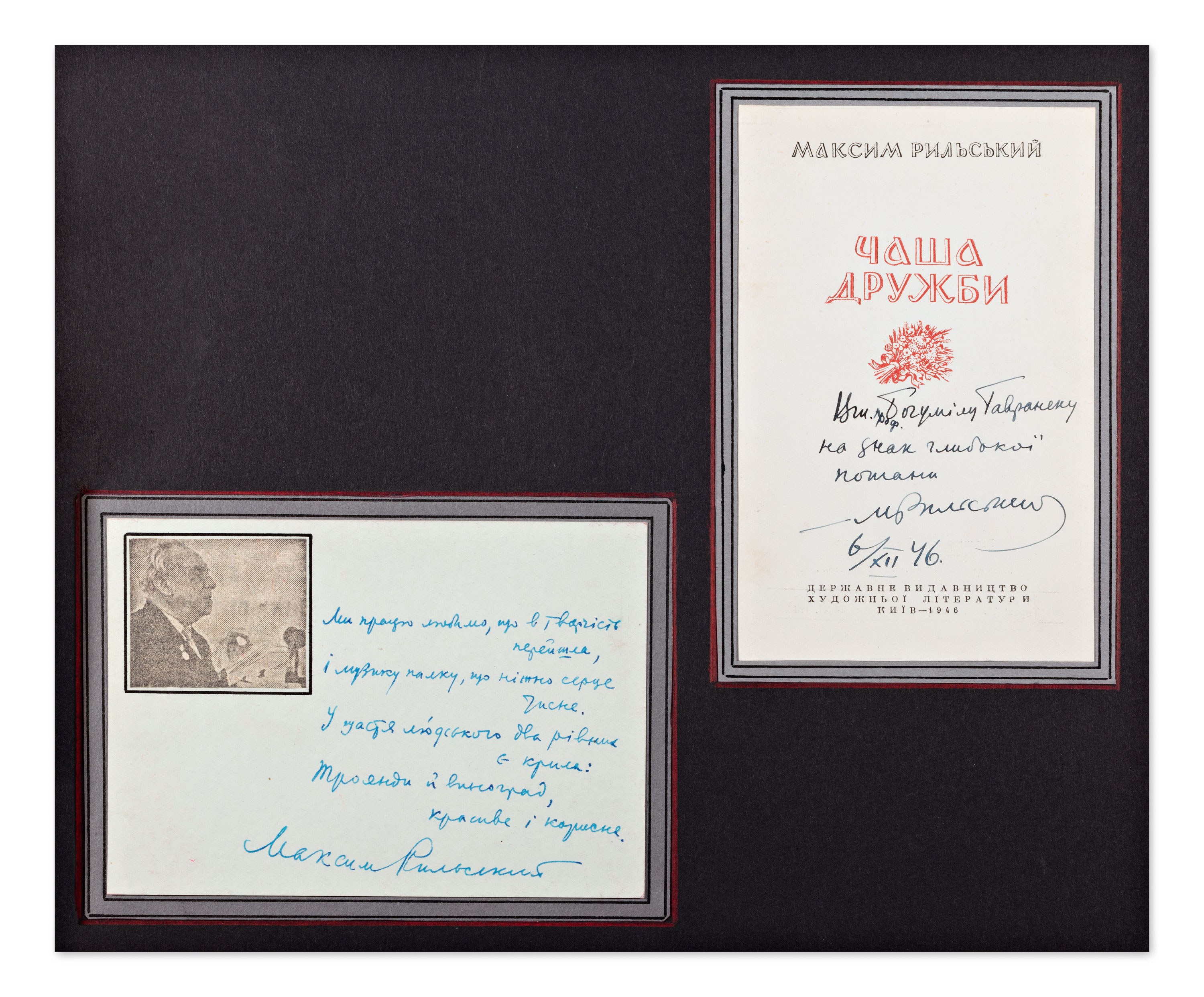 Set containing a handwritten excerpt of a poem and the title page of the book "Číše přátelství" with a personal dedication from the renowned Ukrainian poet Maksym Rylsky.On the first page is a quote from his work: