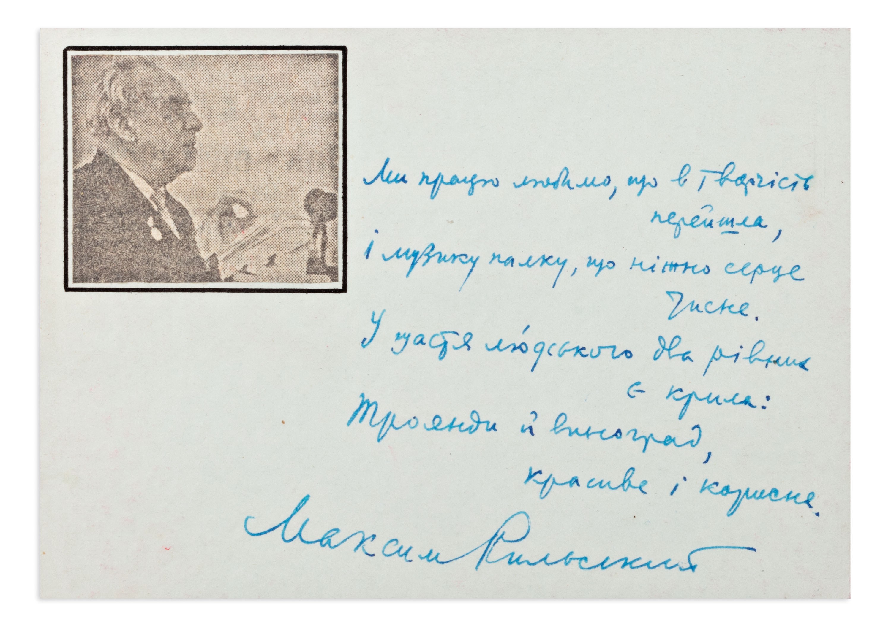 Maksym Rylsky was one of the most significant Ukrainian poets of the 20th century, whose work was characterized by deep lyricism, a love for nature, and the philosophy of a harmonious connection between beauty and utility. This example of his handwriting is not only a poetic statement but also a testament to his connections with the Czech intellectual community.