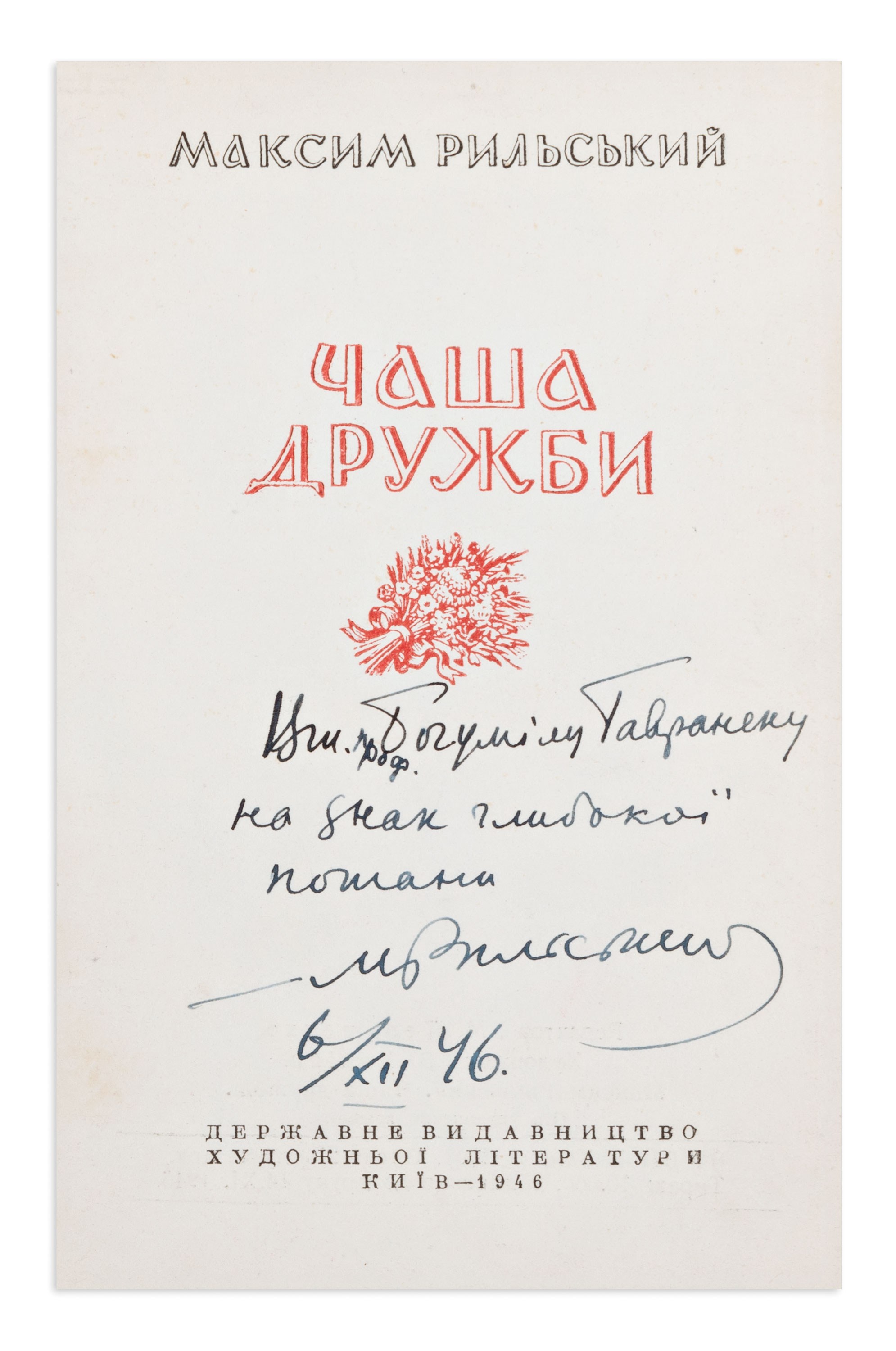 Additionally, there is the title page of the book "Číše přátelství" (The Chalice of Friendship), published in 1946 in Kyiv, containing Rylsky’s handwritten dedication to Professor Bohumil Havránek, a leading Czech linguist and Slavist.