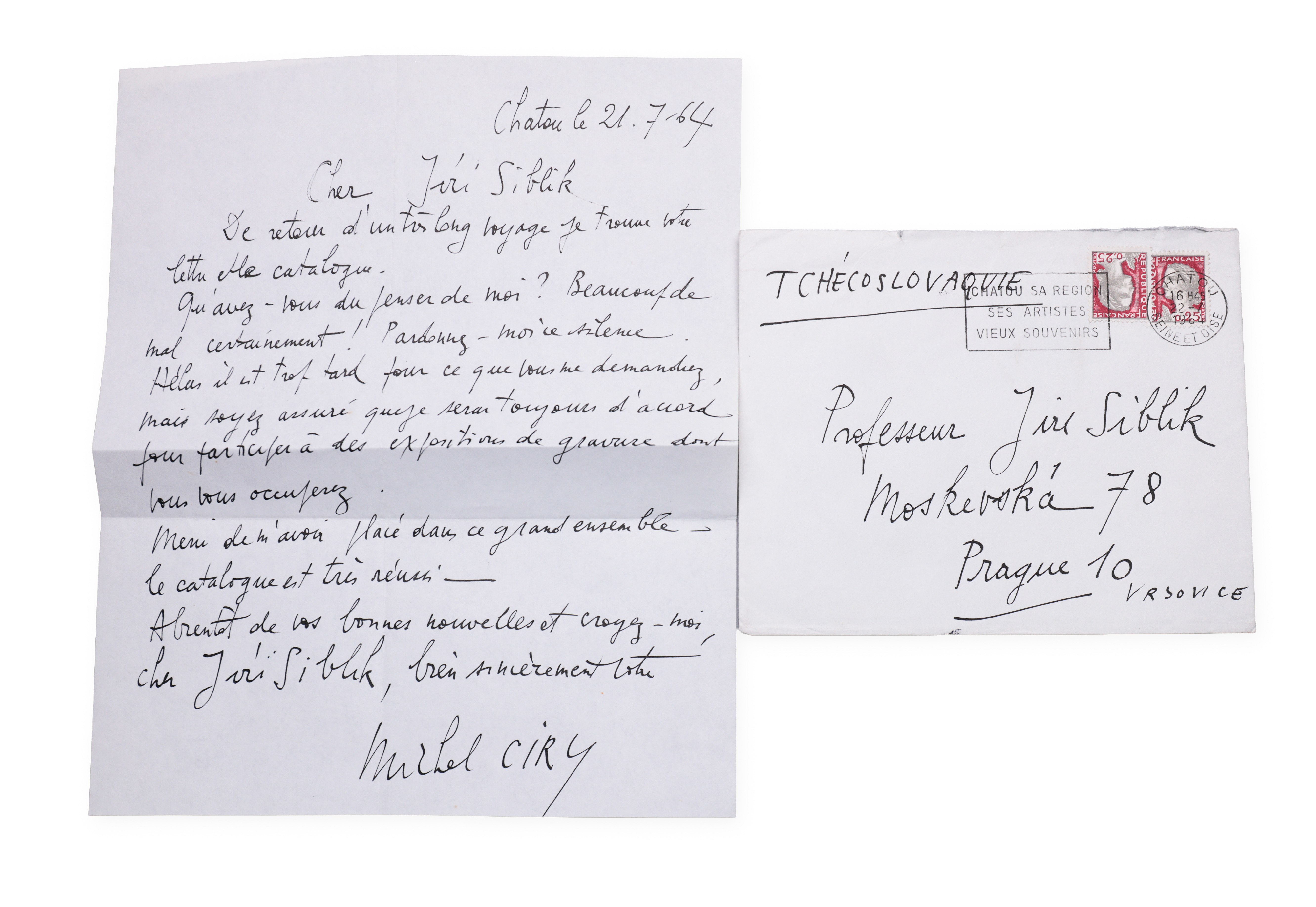Handwritten letter signed by Michel Ciry, dated July 21, 1964, addressed to Jiří Siblík. Michel Ciry was a French painter, graphic artist, writer and composer, known for his spiritually attuned work and distinctive visual style. The letter represents personal correspondence with a Czech addressee in the context of international cultural contacts in the 1960s.Bidders are obliged to inform themselves about the condition of the lots before the auction, subsequent complaints will not be taken into account.