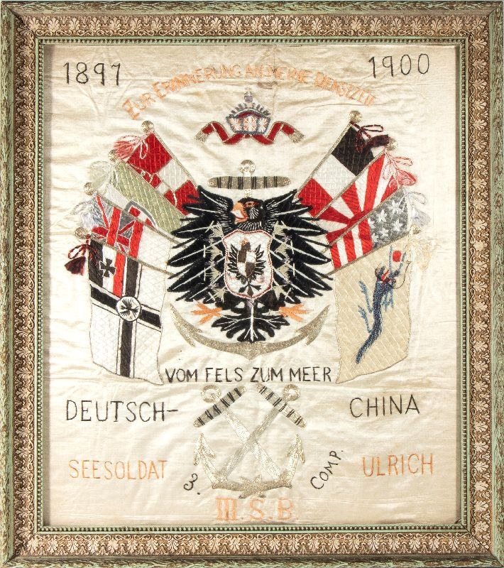 Embroidered silk banner commemorating the mission to China, 1897-1900, commemorating a German soldier of the 3rd Company of the Navy. Splendidly embroidered in silk thread and silver wire, with the inscription "ZUE ERINNERUNG AN MEINE DIENSTZEIT - VOM FELS ZUM MEER - DEUTSCH CHINA - SEESOLDAT ULRICH" (IN MEMORY OF MY SERVICE - FROM THE ROCK TO THE SEA - GERMAN CHINA - SAILOR ULRICH)With a contemporary frame, in good condition. Measures approximately 48 x 57 cm.