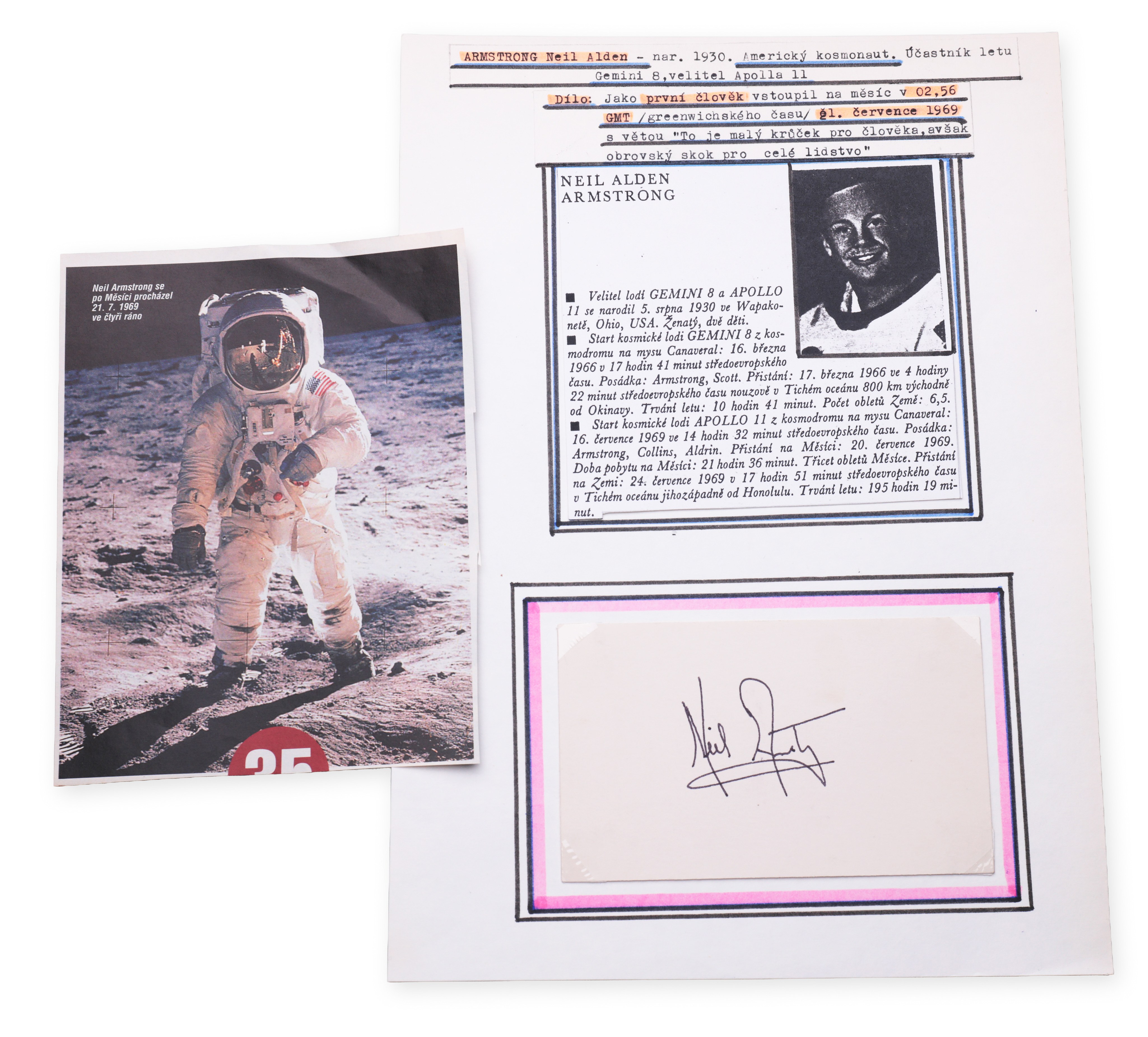 Signed clipping on collector's sheet signed by Neil Armstrong, American astronaut and the first man to walk on the surface of the moon. He reached a historic moment during the Apollo 11 mission on July 20, 1969, when he uttered the famous words: "That's one small step for a man, one giant leap for mankind."Bidders are obliged to inform themselves about the condition of the lots before the auction, subsequent complaints will not be taken into account.