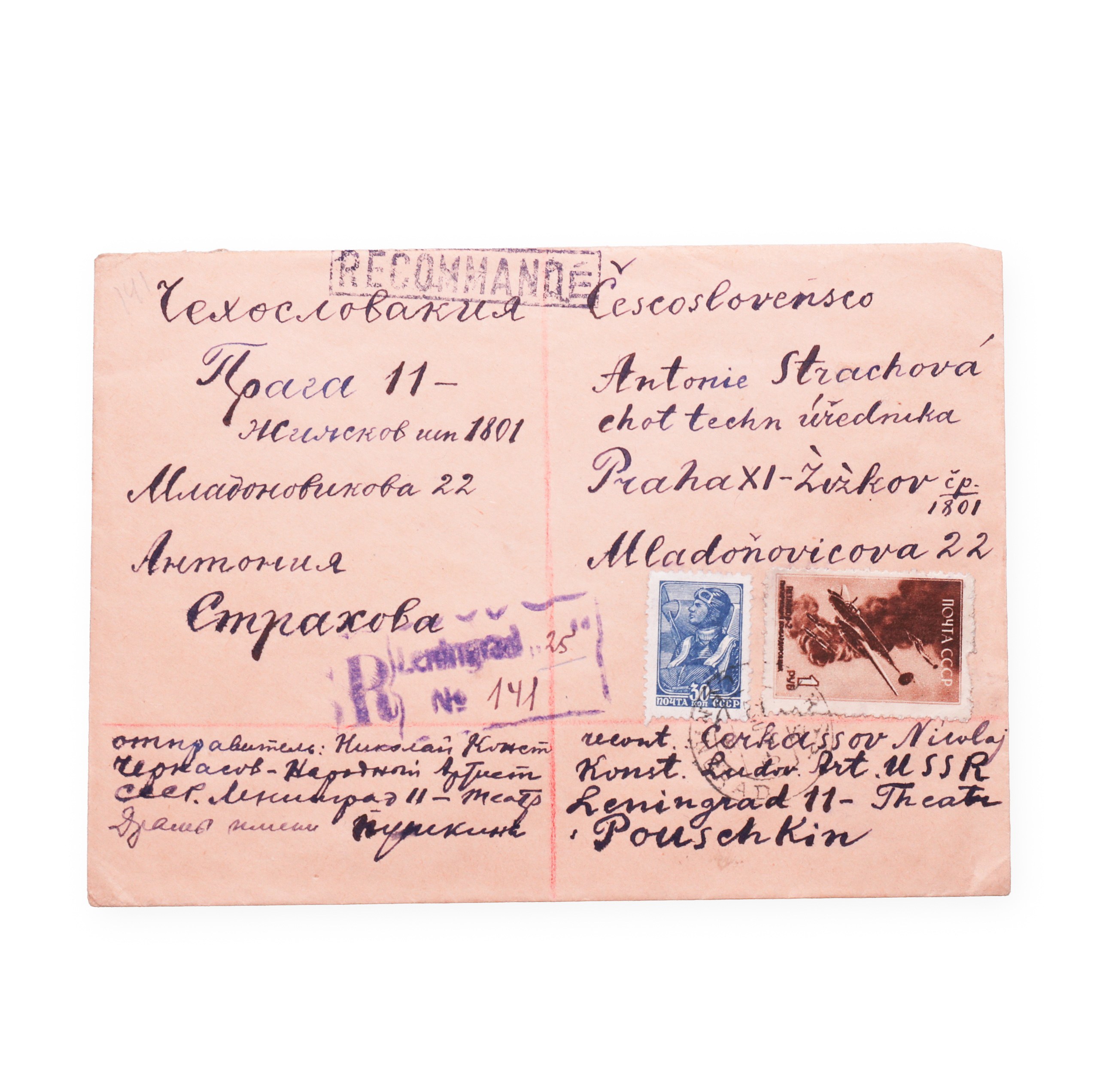 Signature of actor Nikolai Cherkasov with handwritten address on envelope sent to Antonia Strachova from Leningrad. The document represents an authentic monument to an important personality of Soviet film and theater, valuable for collectors and those interested in the cultural history of the 20th century.Bidders are obliged to inform themselves about the condition of the lots before the auction, subsequent complaints will not be taken into account.