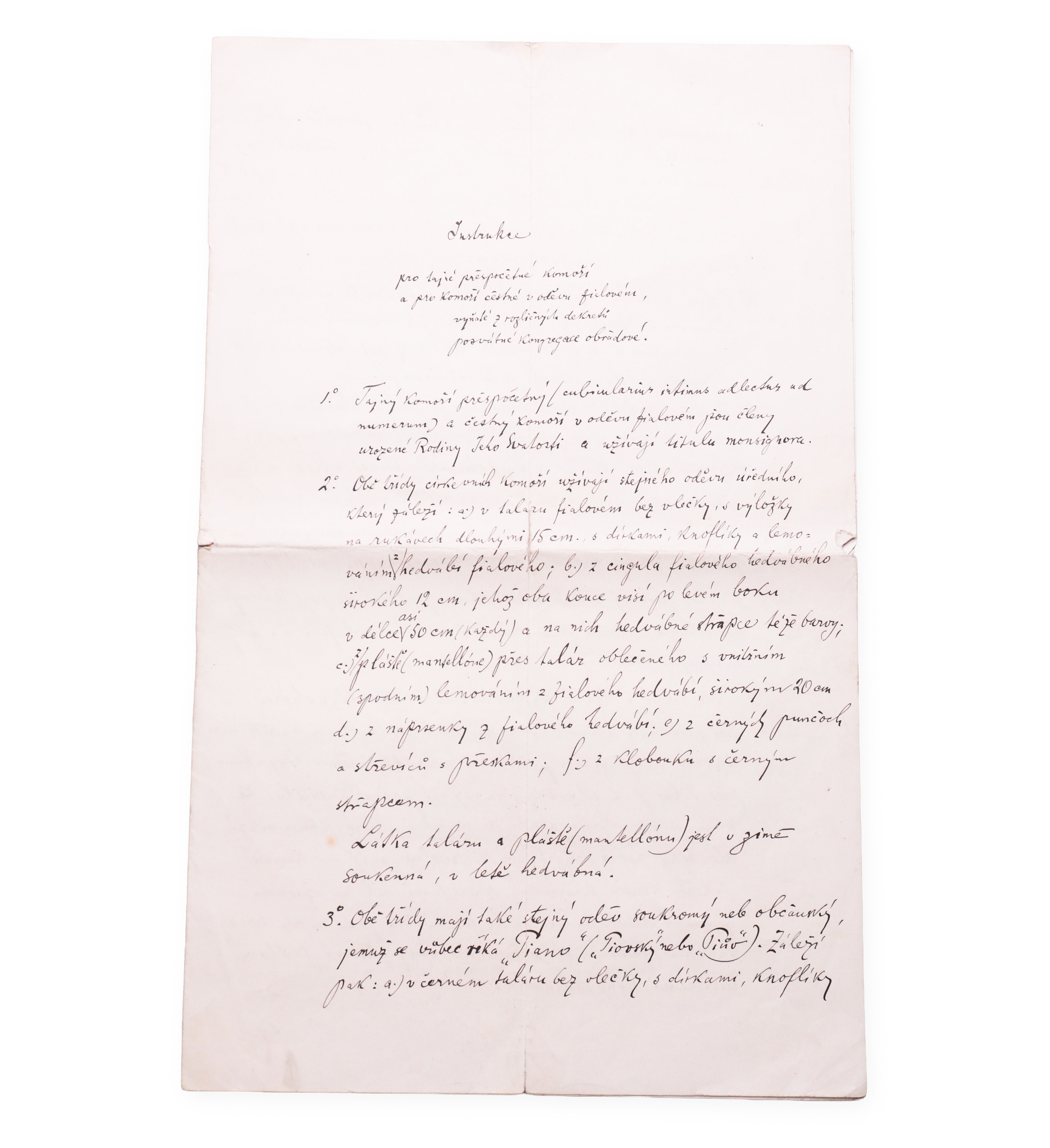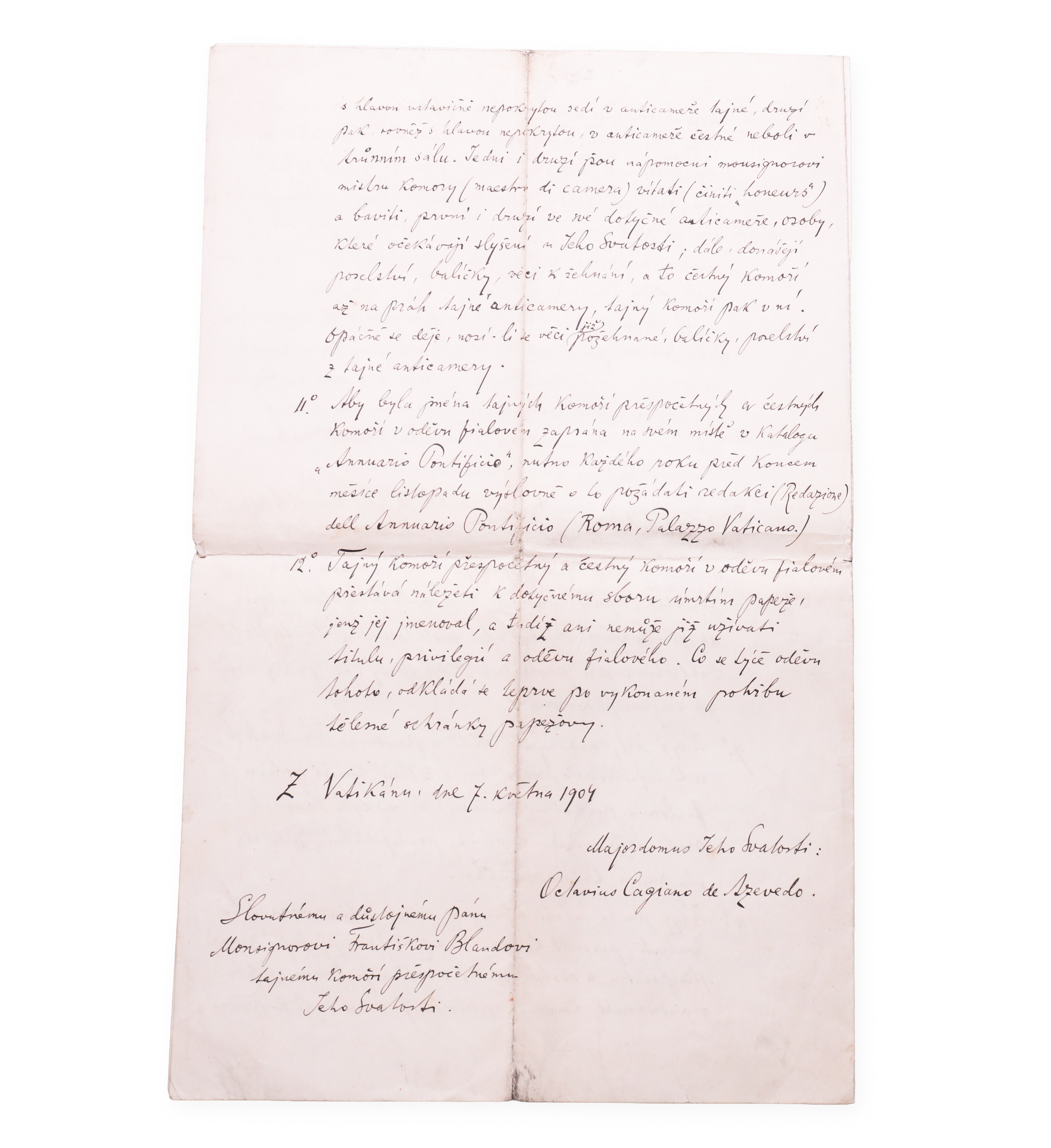 A handwritten Czech translation of the official instructions issued by the Holy Congregation of Rites in the Vatican on May 7, 1904. The document is addressed to Monsignor František Bland, Privy Chamber Provost, and contains detailed instructions on the dress and ceremonial duties of the Privy and Honorary Papal Chambers. The translation faithfully follows the original Latin-Italian text and ends with a transcription of the name of the butler of His Holiness, Cardinal Ottavio Cagiana de Azevedo, but it is not his handwritten signature. It is only the written name translated together with the text. The document thus represents an administrative aid intended for the needs of the Czech recipient, not an original or signed official document from the Vatican.Bidders are obliged to inform themselves about the condition of the lots before the auction, subsequent complaints will not be taken into account.