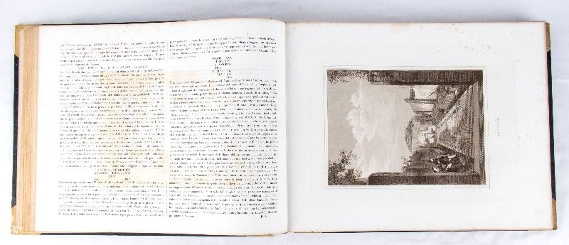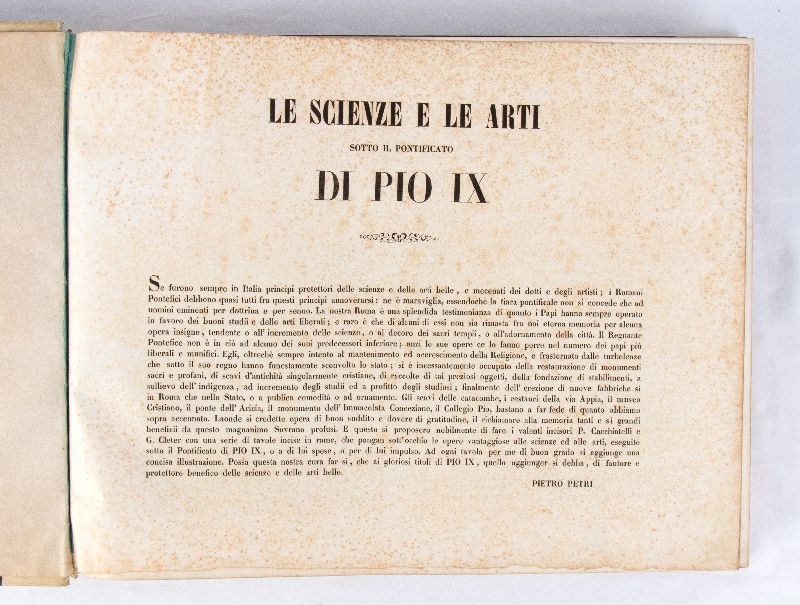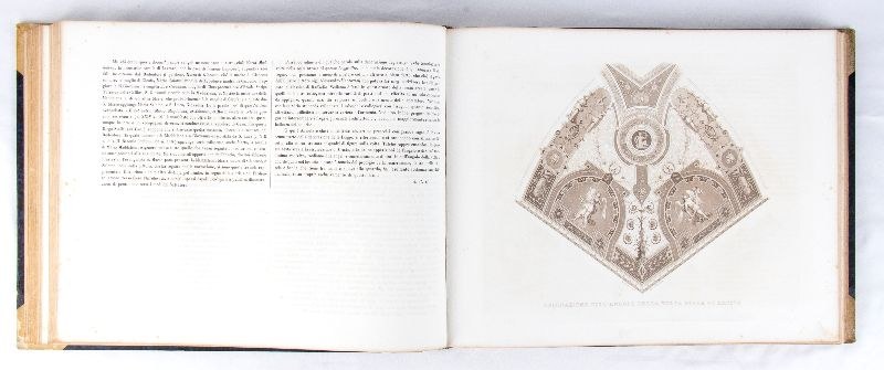 "The Sciences and the Arts under the Pontificate of Pius IX" - 1860/1867 - Engravings by Paolo Cacchiatelli and Gregorio Cleter, etchings accompanied by critical commentary by Pietro Petri, Francesco Cerroti, Carlo Mascherpa, and Domenico Bonanni.A majestic and valuable work that represents the desire of Pope Pius IX, pontiff from 1846 to 1870, to disseminate and promote his cultural policy, characterized by significant urban, architectural, and artistic interventions.The work was conceived to be distributed monthly in installments, with the publication of two plates per month along with accompanying critical apparatus. The publishing venture was funded by Peter's Pence and was enhanced by the decision to entrust its curation to Cacchiatelli and Cleter: the "Editorial Artists" (as they are referred to in the texts of the plates), who created a rich iconographic apparatus that fostered awareness of the pope's commitment.Two oblong volumes, 39 x 30 cm, hardcover, contemporary binding, blue marbled paper, gilt-embossed faux leather spine and corners. Contains 187 exceptionally beautiful and beautifully crafted engravings, a photographic testimony to the past.Volume I, title page: "Printed in Rome by the Tipografia delle Belle Arti - Palazzo Poli number 91 - 1860," 202 pp., 86 engraved copies. In excellent condition, pages with occasional light foxing.Volume II, title page: "The Sciences and the Arts under the Pontificate of Pius IX," with commentary by Pietro Petri, 1867, 202 pp., 101 engraved copies. In excellent condition, pages with occasional light foxing.