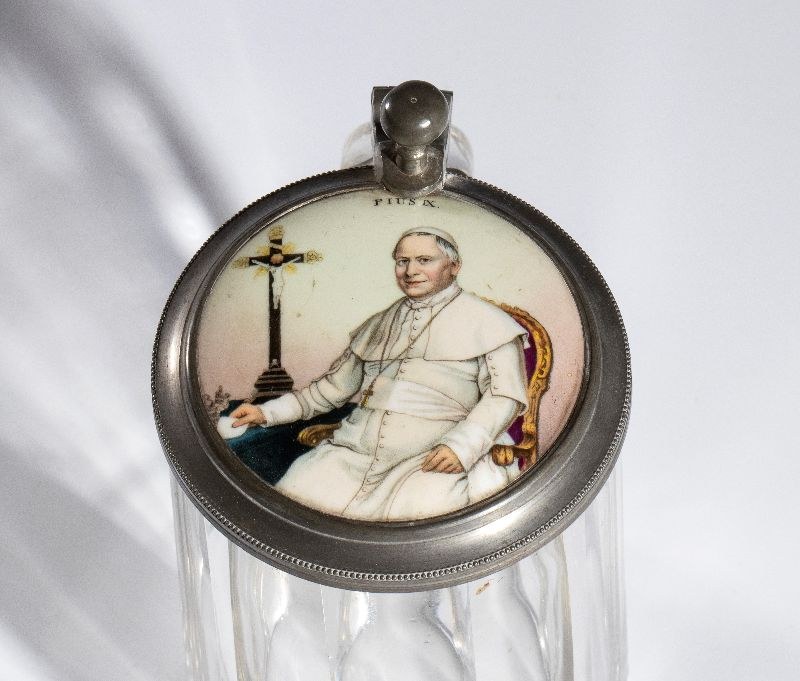 Faceted glass tankard with a metal stopper and frame, featuring a cameo with a full-length portrait of Pope Pius IX seated on his throne, flanked by a crucifix.Fixé portrait to porcelain, perfect. Original, second half of the 19th century.Measures approximately 16 cm, in perfect condition.