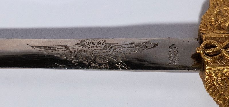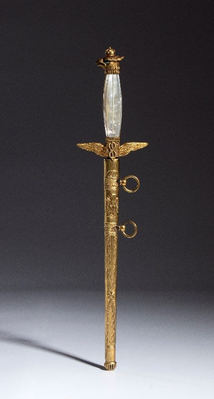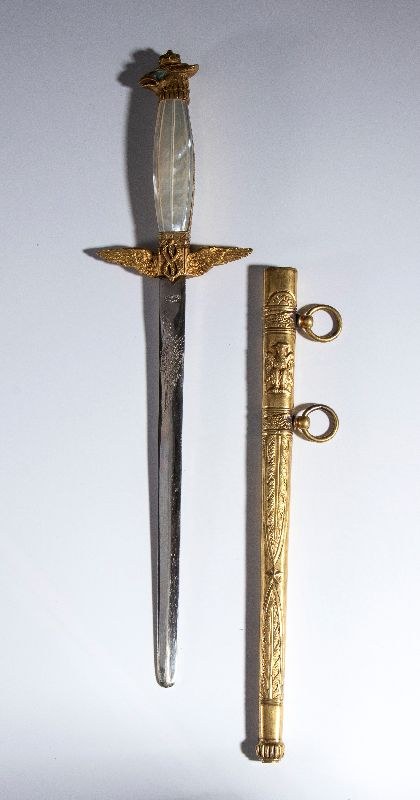 Sword for cadet academy members of the Royal Air Force. To be worn as an accessory to the High Uniform, Gala Uniform.Marked GILARDONI - MILANO, with a crowned eagle with open wings engraved on one side of the blade, a crowned eagle's head grip, and a guard in the shape of open wings with a Savoy knot in the center. The blade lacks the cutting edge and cutting edge, as required by regulations, as it is not a bladed weapon but merely a decorative accessory to the uniform.Complete with the original brass scabbard, embossed with an imperial eagle and decorative motifs, and with two loops for belt suspension.Measures approximately 38 cm in total length.In perfect condition.