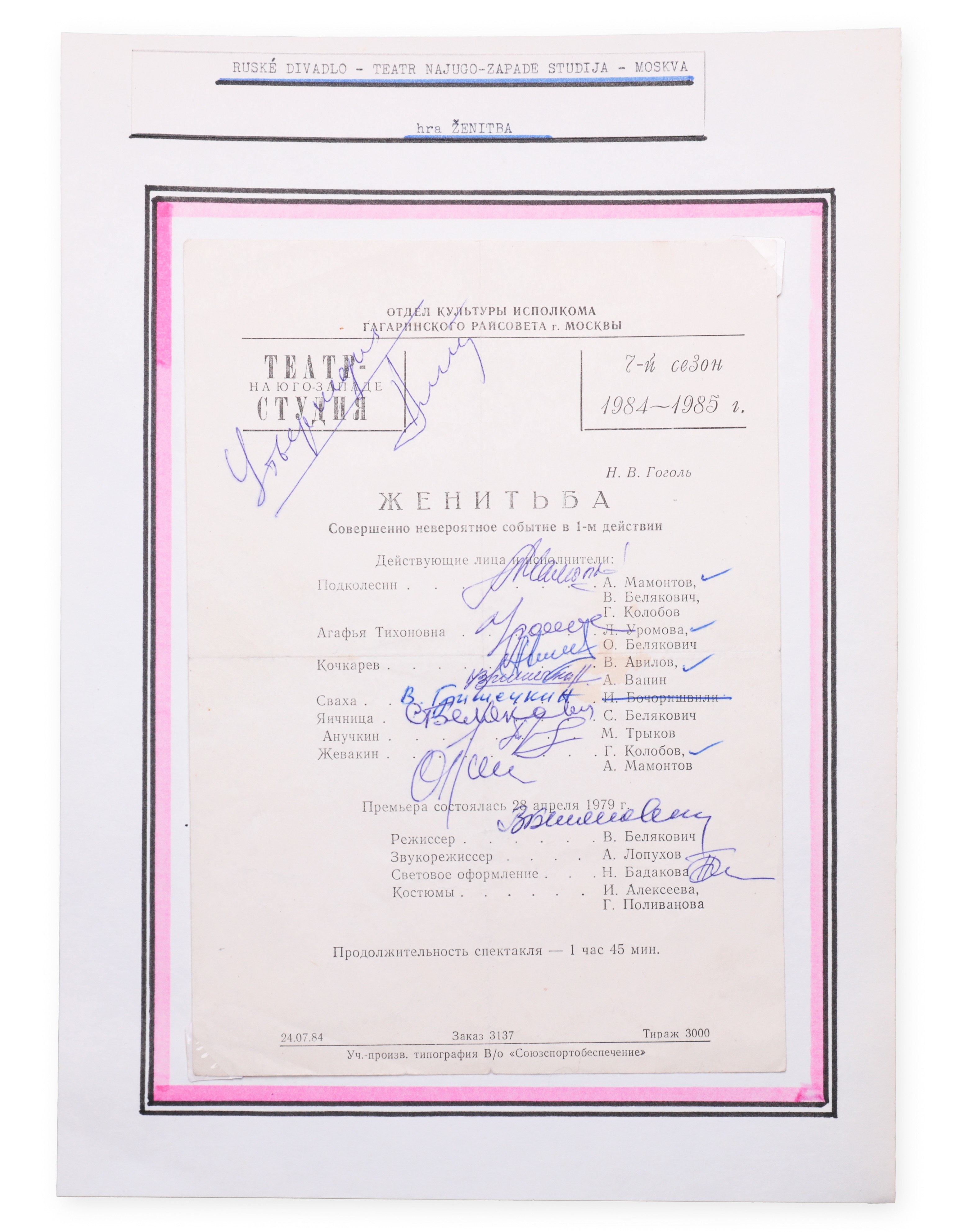 Signatures of members of the Russian Theater including names such as Mamontov, Chromova, Beljakovič and others on the theater program, placed on a collector's sheet. These actors were part of the Russian theater émigré, which was active in Europe in the 1920s and 1930s, bringing the classic Russian repertoire as well as a new perspective on theater art. The signed program is a valuable document of the activities of this important artistic group and has historical and collectible value.Bidders are obliged to inform themselves about the condition of the lots before the auction, subsequent complaints will not be taken into account.