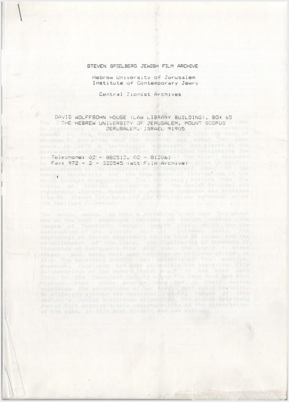 Steven Spielberg Jewish Film Archive, Hebrew University of Jerusalem, angol nyelvű tájékoztató, mappában