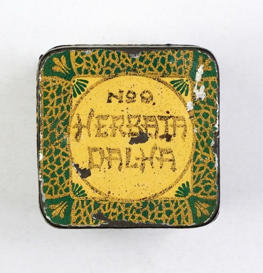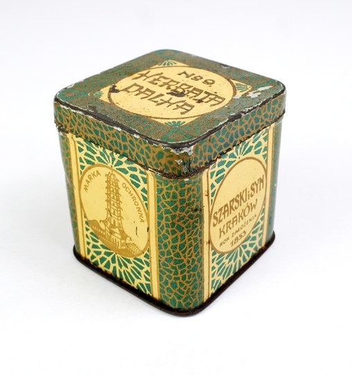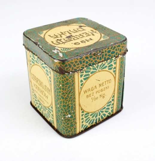 Puszka prostopadłościenna form. 5,5x5,5x6,1 cm. Wieczko luzem. Zielono-złote zdobienia na kremowym tle. Na wieczku nazwa produktu. Na bocznych ściankach nazwa firmy (z informacją, że istnieje od 1853), nazwa herbaty, waga i marka ochronna w postaci dalekowschodniej wieży. Niewielkie ubytki farby na krawędziach.