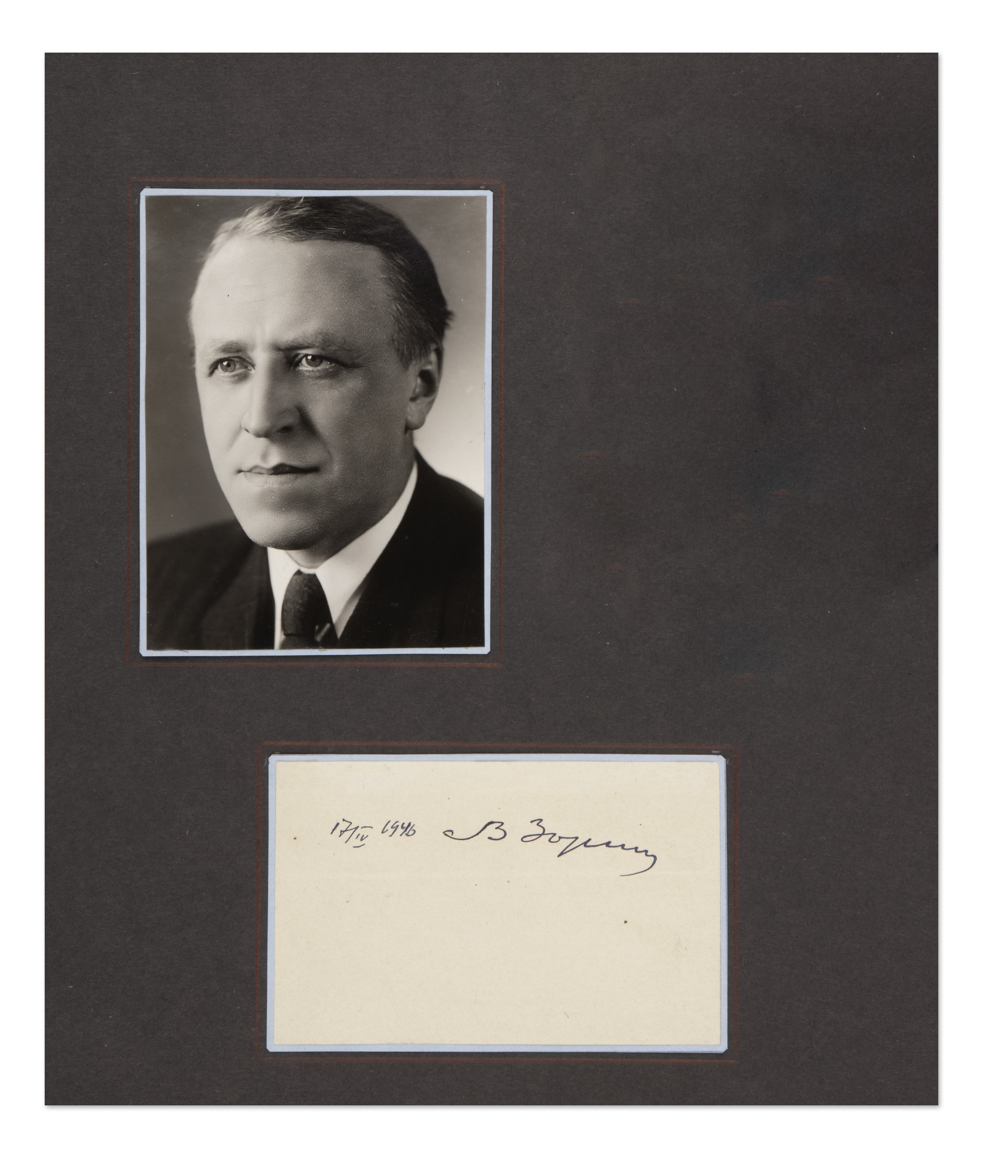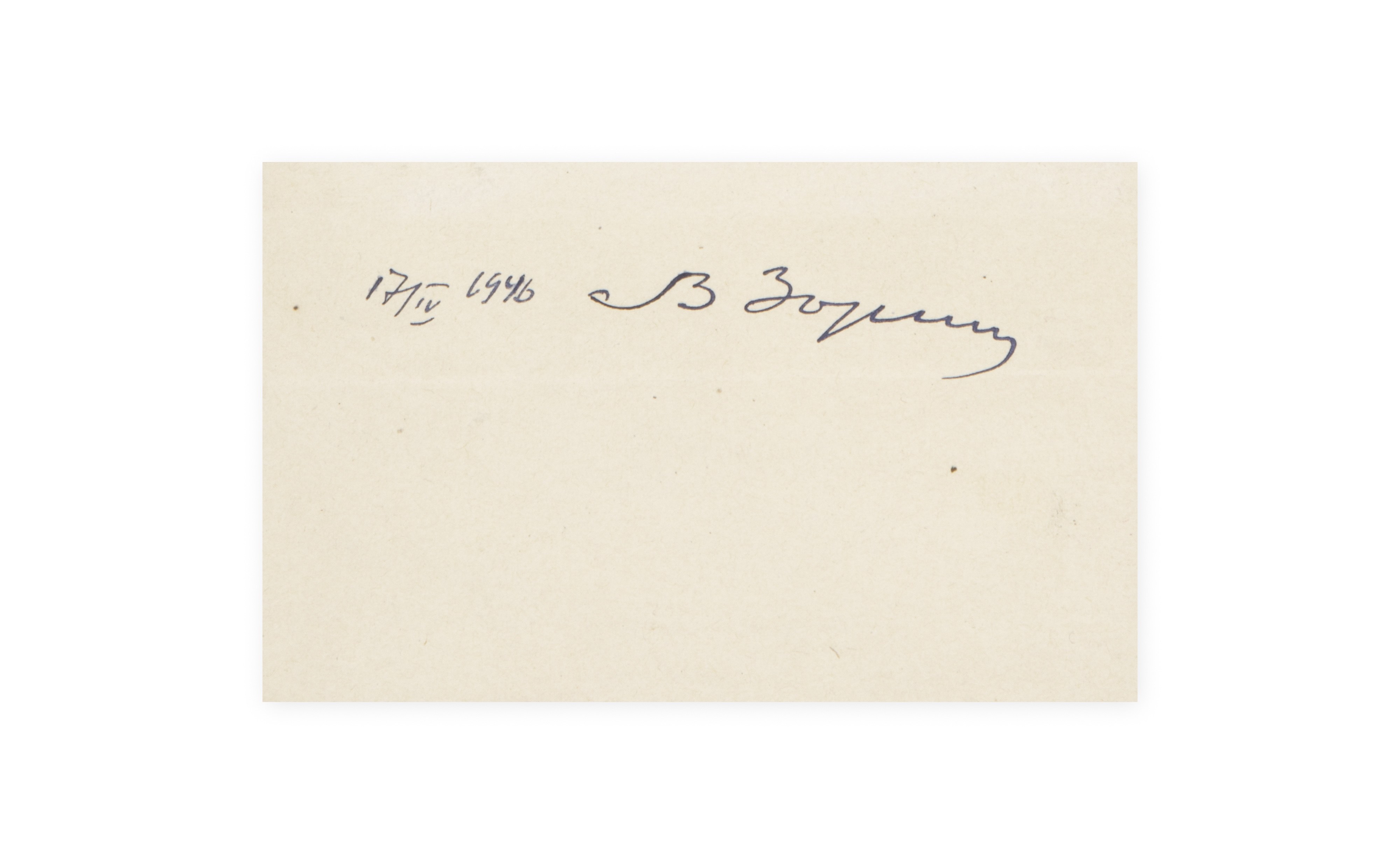 Original signature of Valerian Alexandrovich Zorin, a prominent Soviet diplomat and politician who was one of the key figures of Soviet diplomacy during the Cold War. The document is dated April 17, 1946. Zorin became famous for his role in the United Nations, where he was the representative of the Soviet Union and where he became one of the most prominent actors during the Cuban Missile Crisis. His diplomatic activity was closely connected with the policy of the USSR towards Western states and Eastern Europe. A unique historical document with an authentic signature of one of the most important Soviet diplomats of the 20th century.Bidders are obliged to inform themselves about the condition of the lots before the auction, subsequent complaints will not be taken into account.