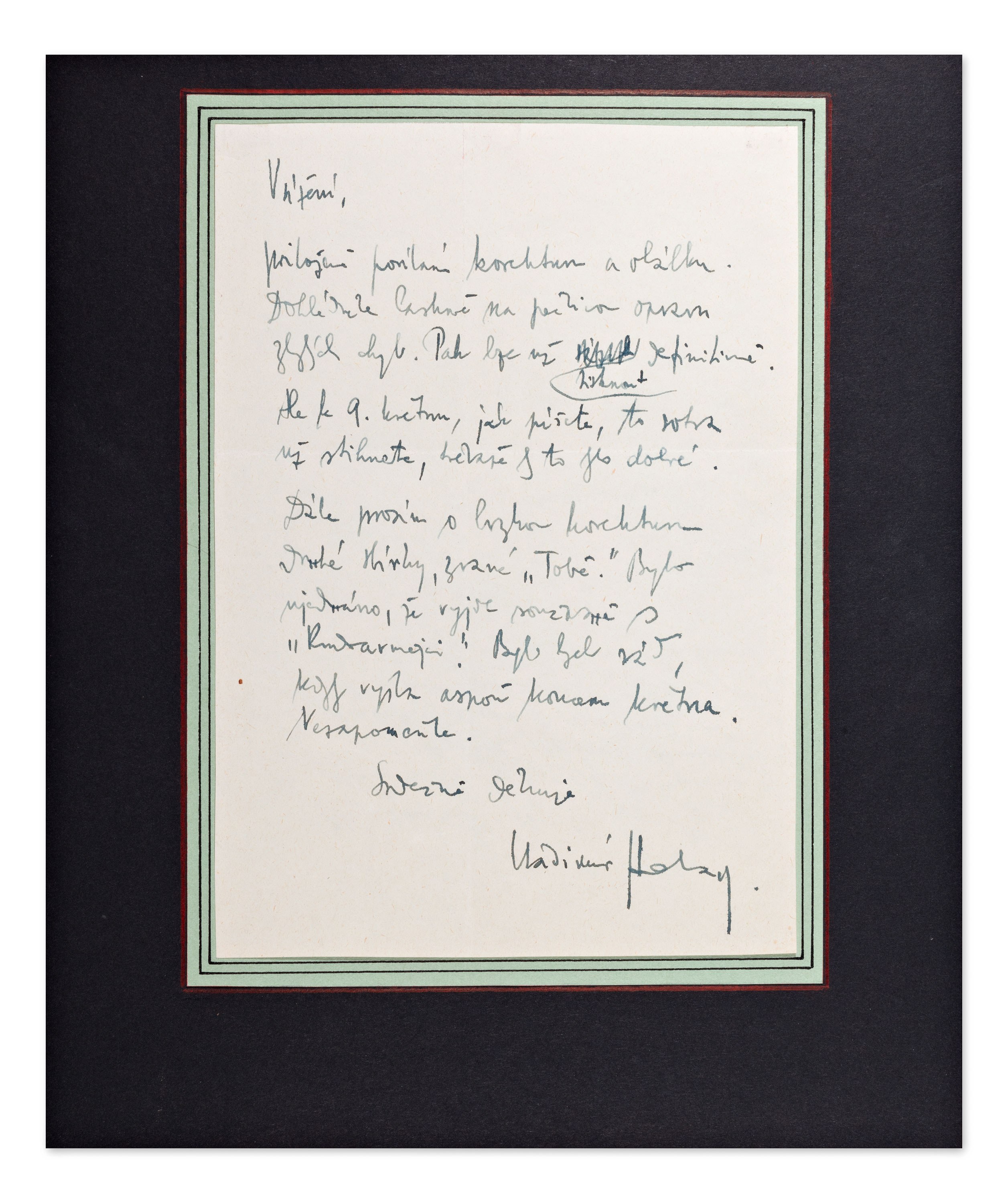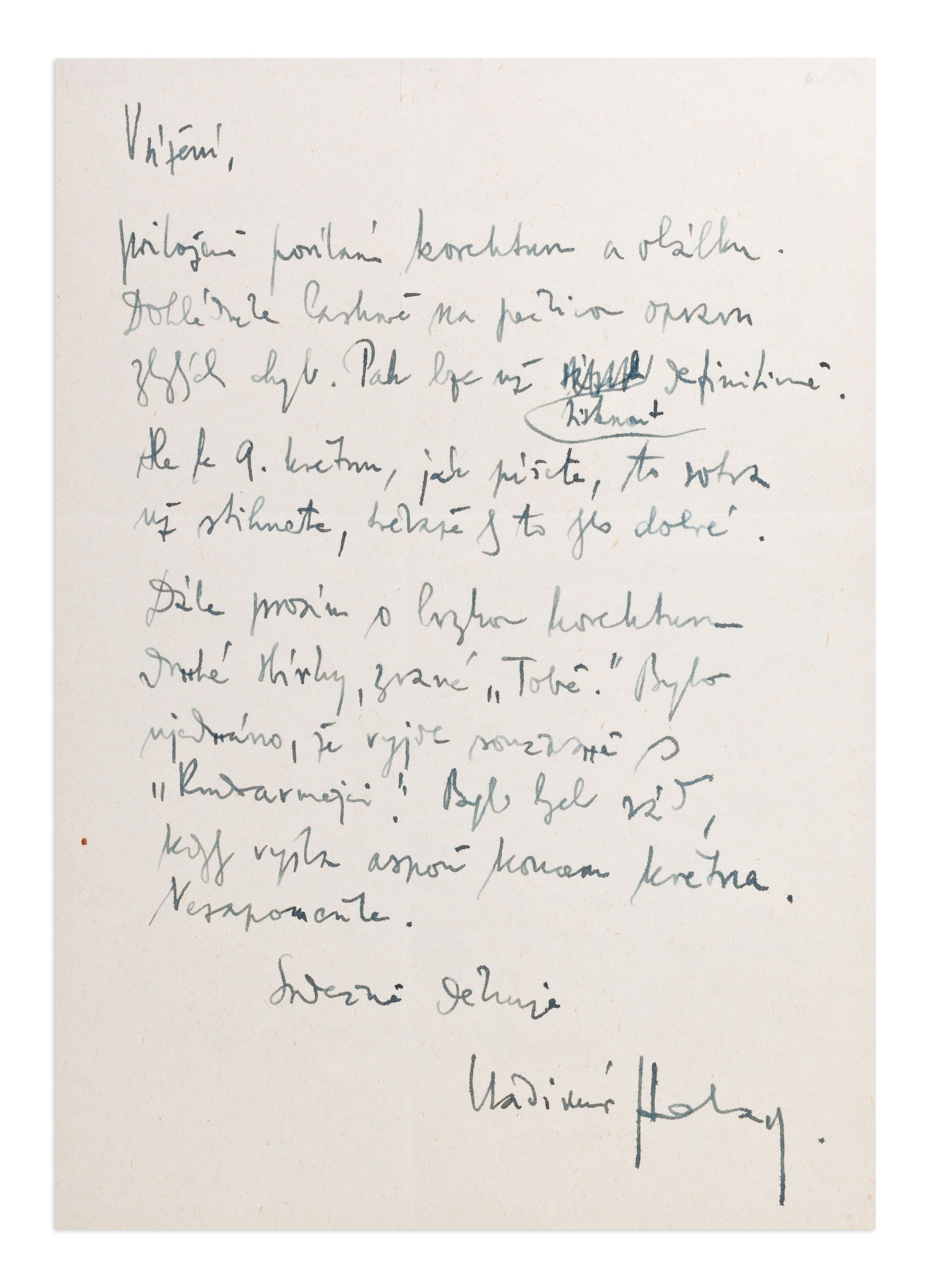 Unique handwritten letter from renowned Czech poet Vladimír Holan, whose work is considered one of the pinnacles of modern Czech poetry. In the letter, Holan discusses revisions to his work, comments on its final form, and touches on other creative fields, including musical composition.