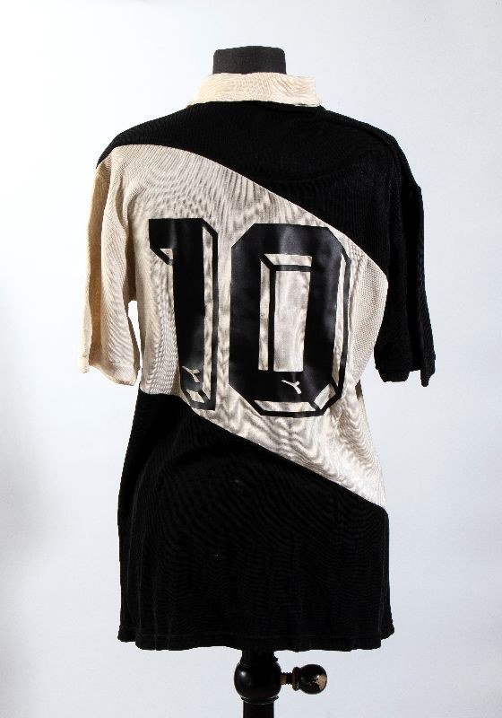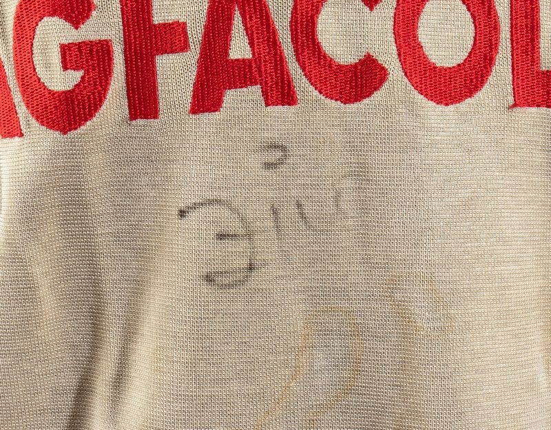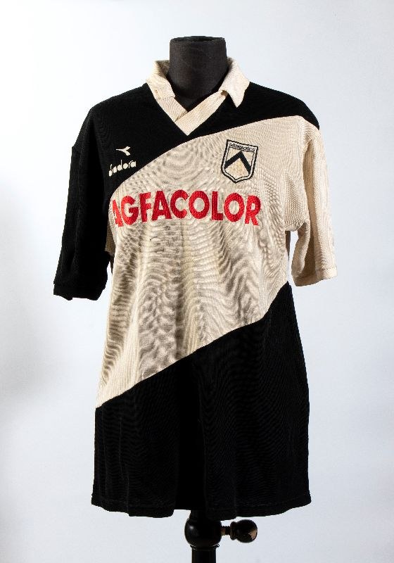 Short-sleeved acrylic match jersey, no tags. Estimated size LOn the front: DIADORA logo in sublimation, AGFACOLOR sponsor in red embroidery, UDINESE CALCIO logo embroidered with remnants inside the paper template.On the back: number 10 in sublimation/heat transfer.Issued/worn by Zico, 1984-85 season. Autograph of the player ZICO in black ink under the sponsor, slightly faded due to age.The jersey is in good condition, with some stains/stain marks and signs of use.Provenance: Sports journalist, private collection