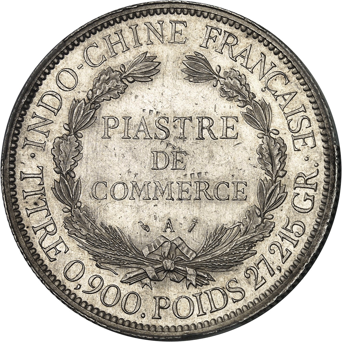 Rv. INDO-CHINE FRANÇAISE / TITRE 0,900. POIDS 27,215 GR. Dans une couronne formée de deux branches composites : PIASTRE DE COMMERCE (différent) (atelier) (différent).