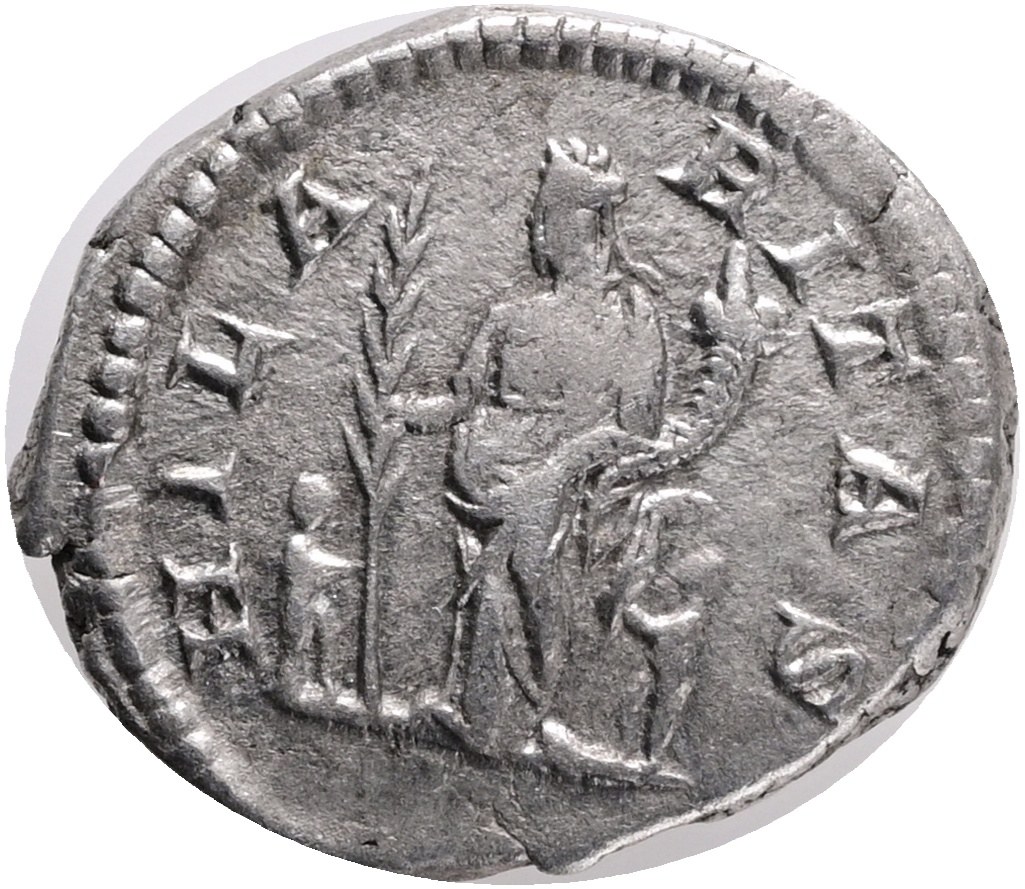 ROMAN EMPIRE: Julia Domna, AR denarius, Rome,Obv.: draped bust right, IVLIA AVGVSTA. Rev.: Hilaritas standing left between two children, holding palm frond and cornucopia, HILARITAS, Ref.:RIC-557 Septimius Severus; Cohen-79, AR. 3,52g.