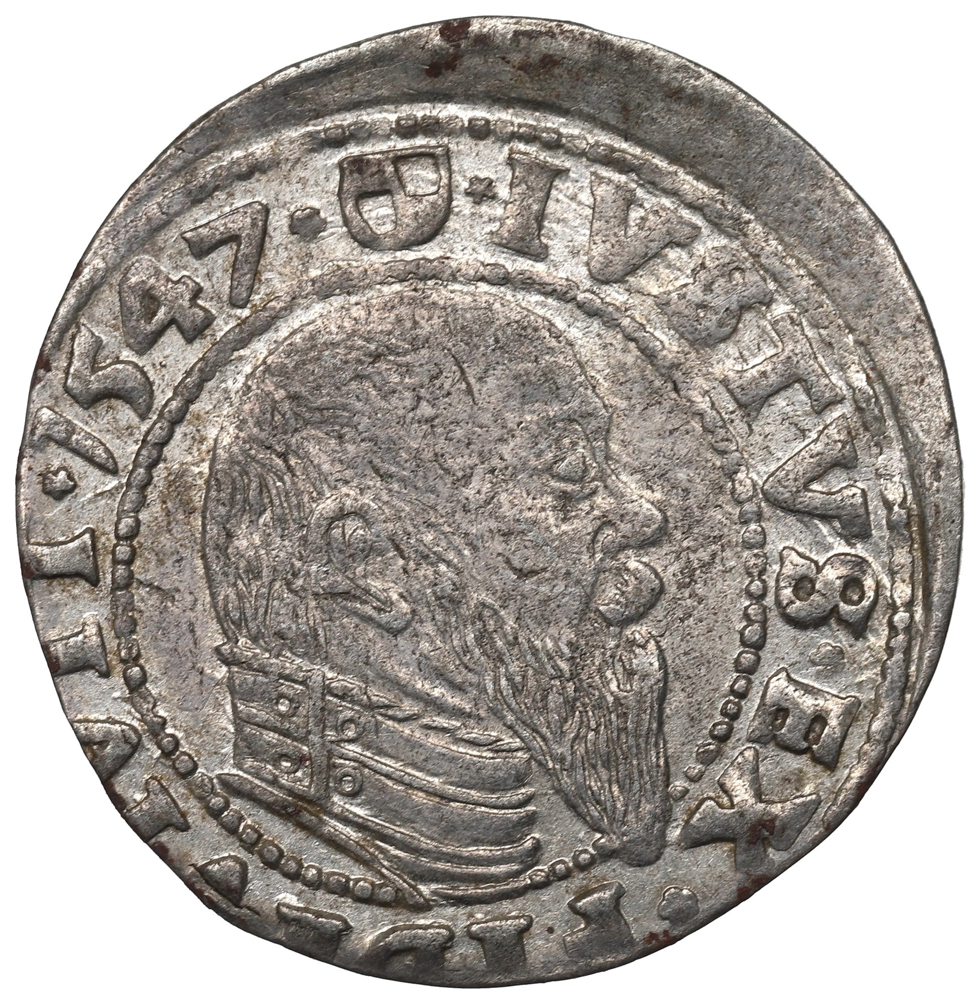 Awers: w otoku perełkowym popiersie w zbroi, w prawo, w otoku zewnętrznym legenda rozpoczynająca się od tarczy:
