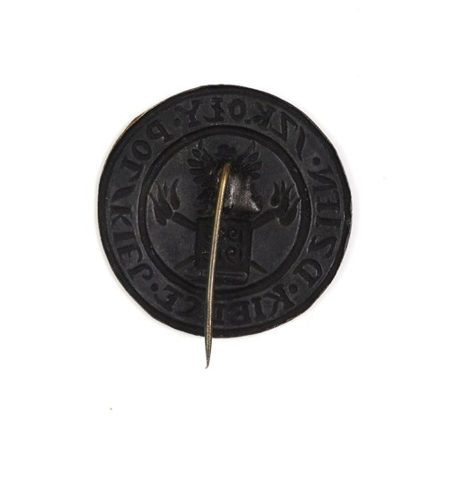Koło średn. 3,5 cm. Rewers z kontrą. Mocowanie na szpilkę.