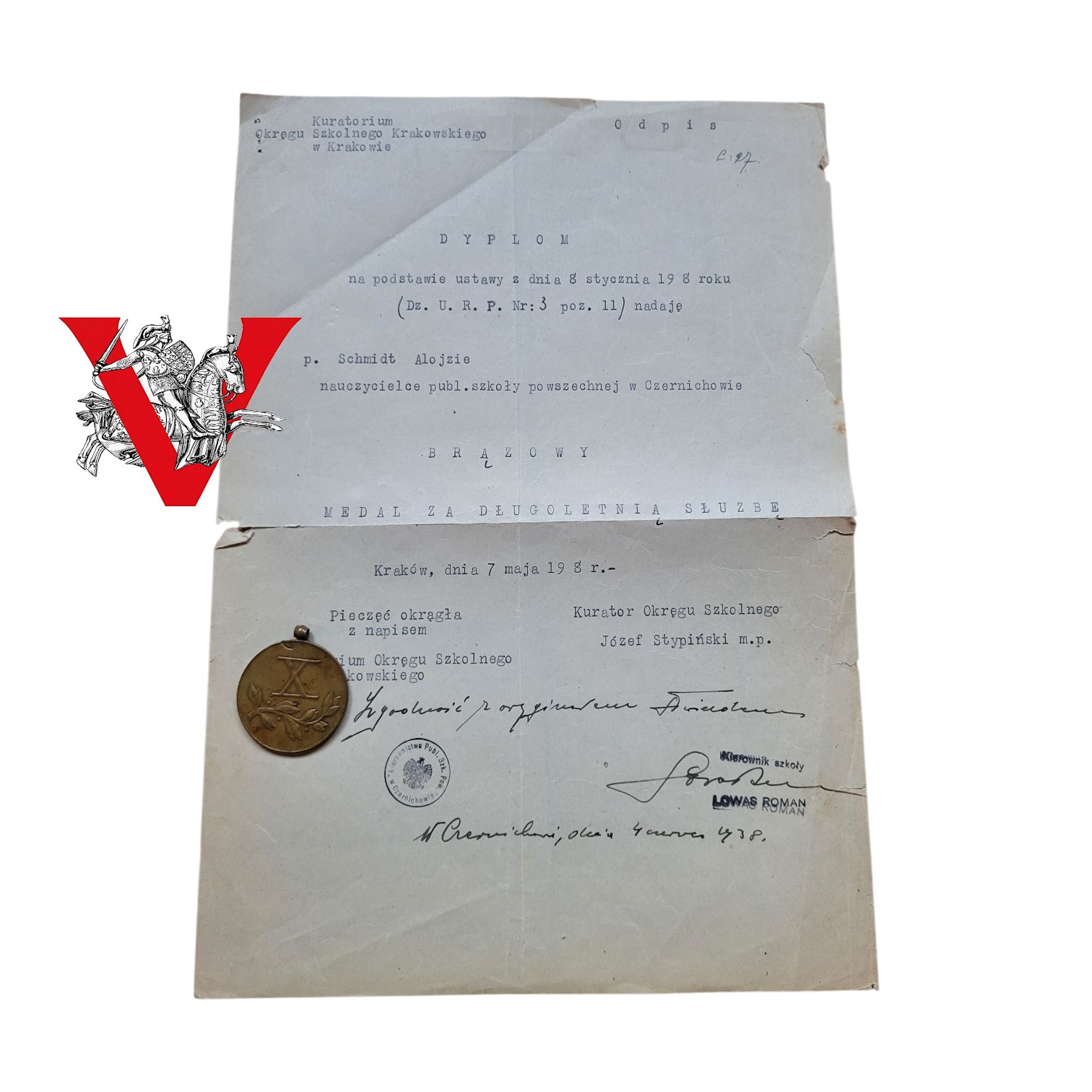 II RP, Medal za Długoletnią Służbę X z dyplomem, Nauczyciel z Czernichowa, 1938 r