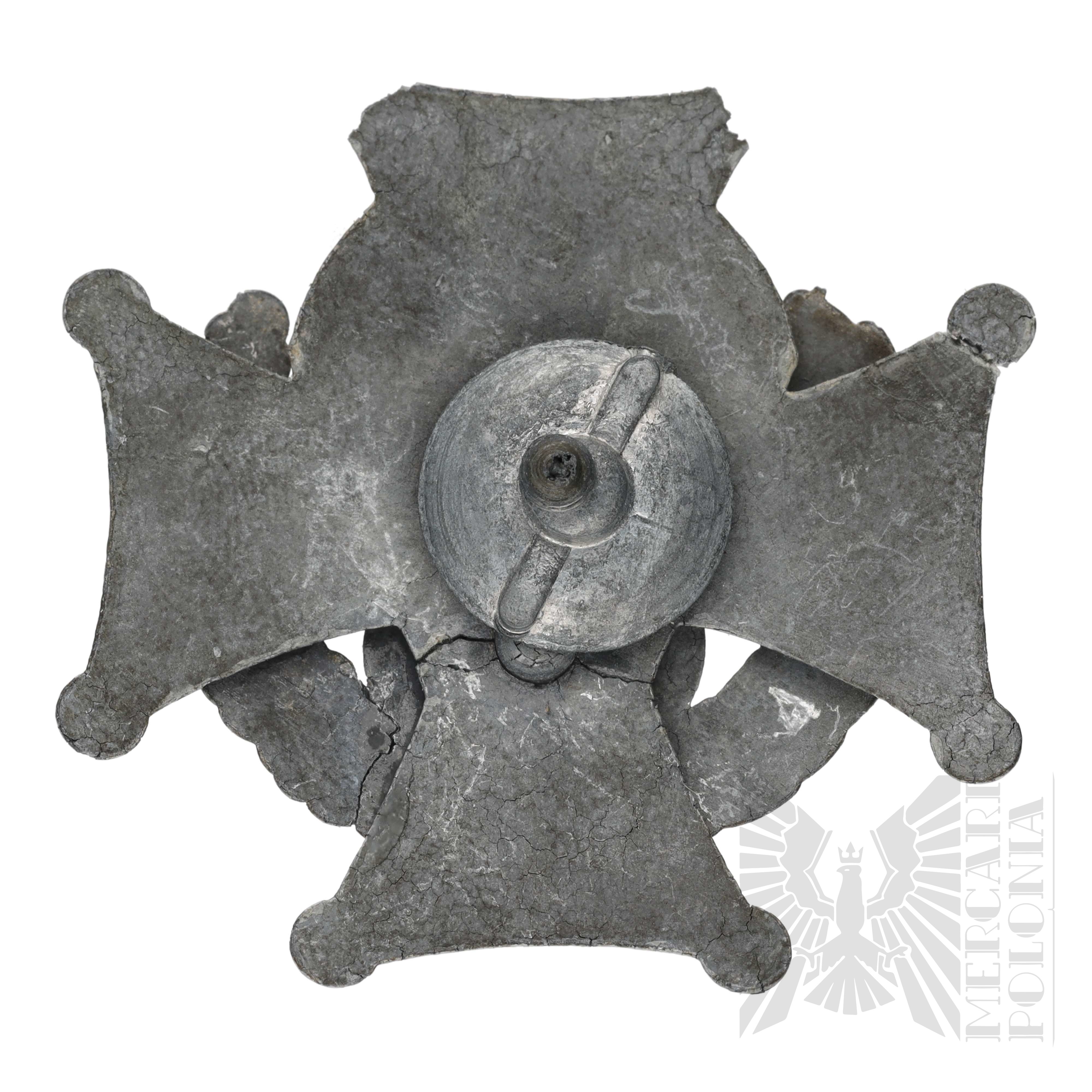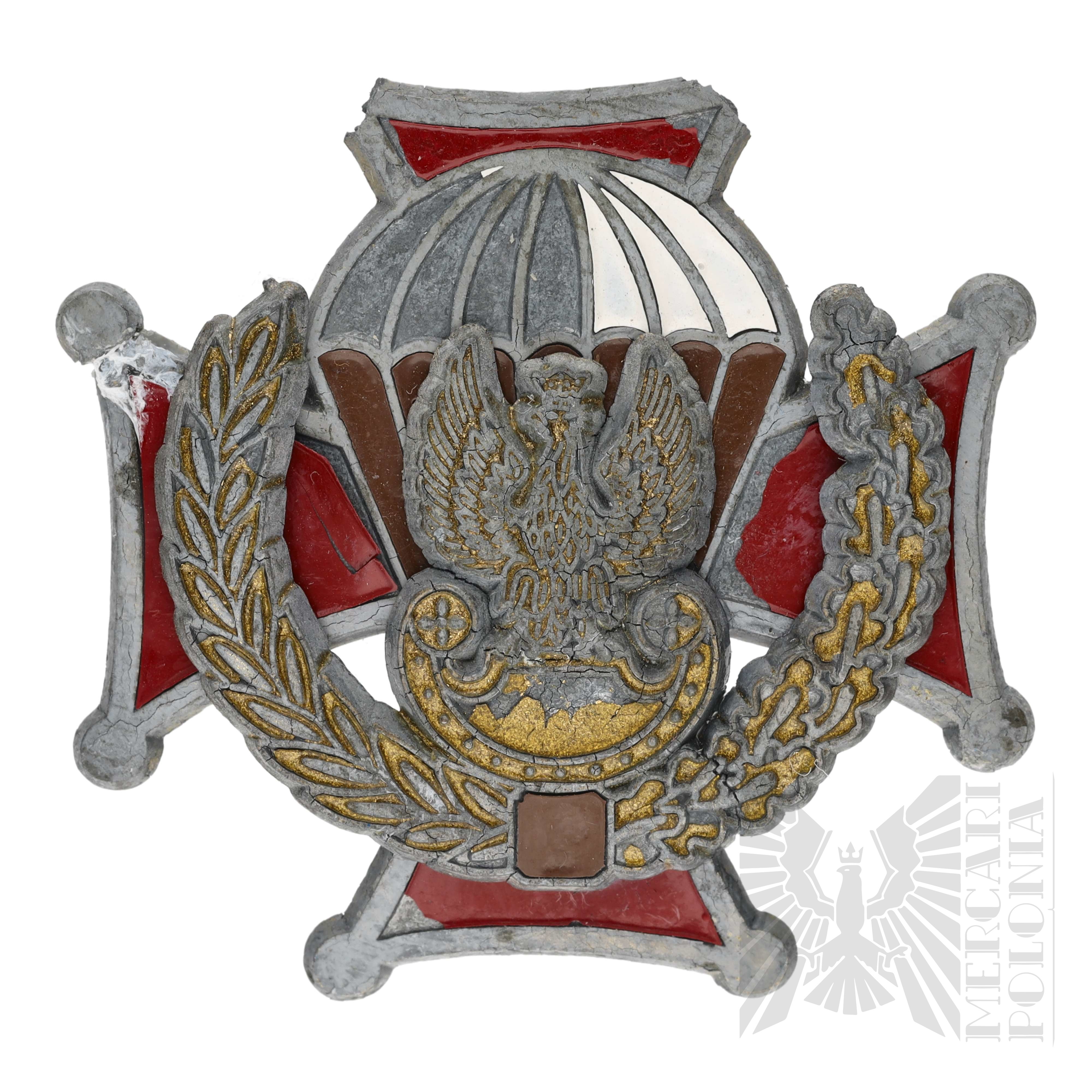 Odznaka w formie Krzyża Virtuti Militari, lakierowana na czerwono, pośrodku widoczny orzeł w koronie oparty na czaszy spadochronu, rewers gładki z widocznymi uszkodzeniami na naprawami, nakrętka prawidłowa.