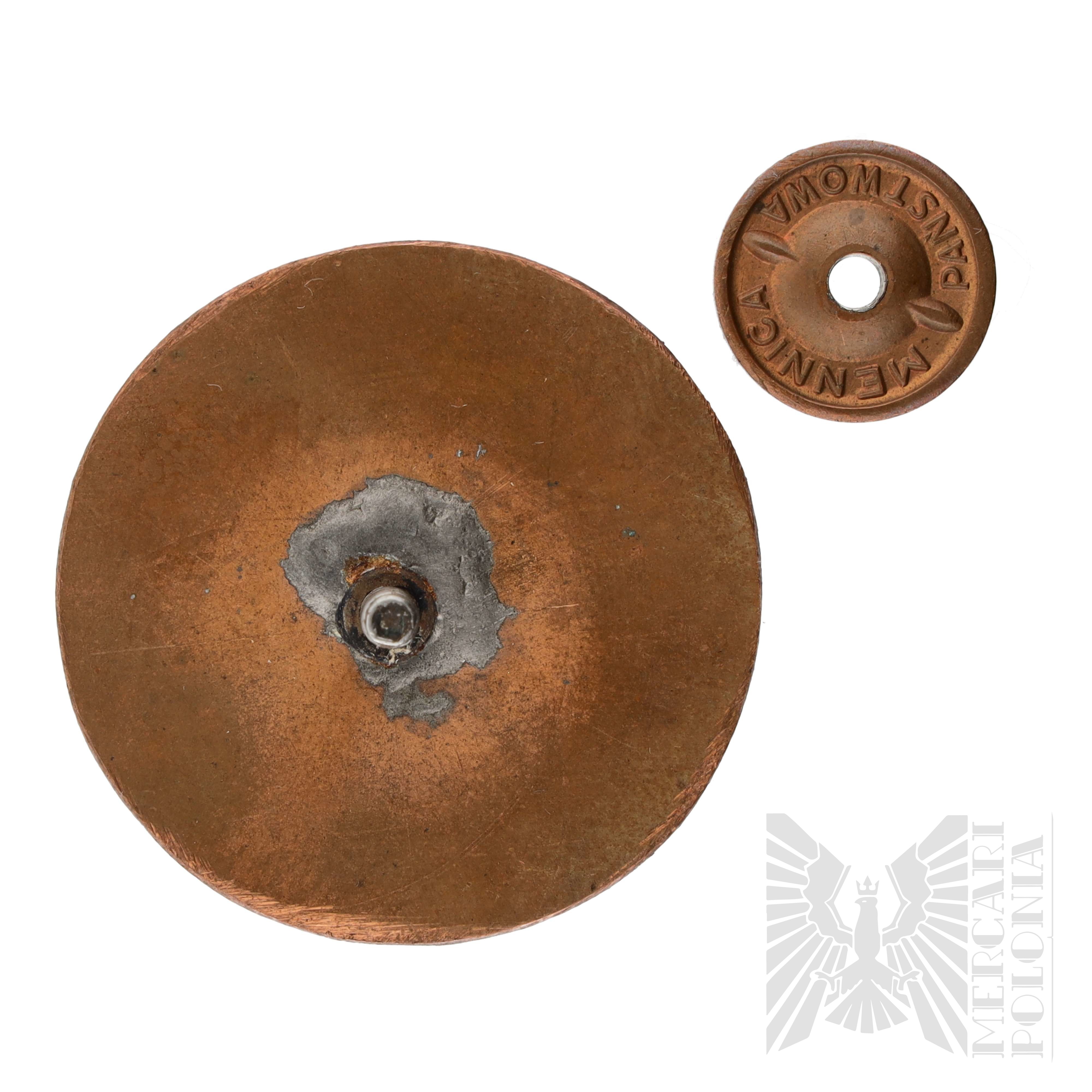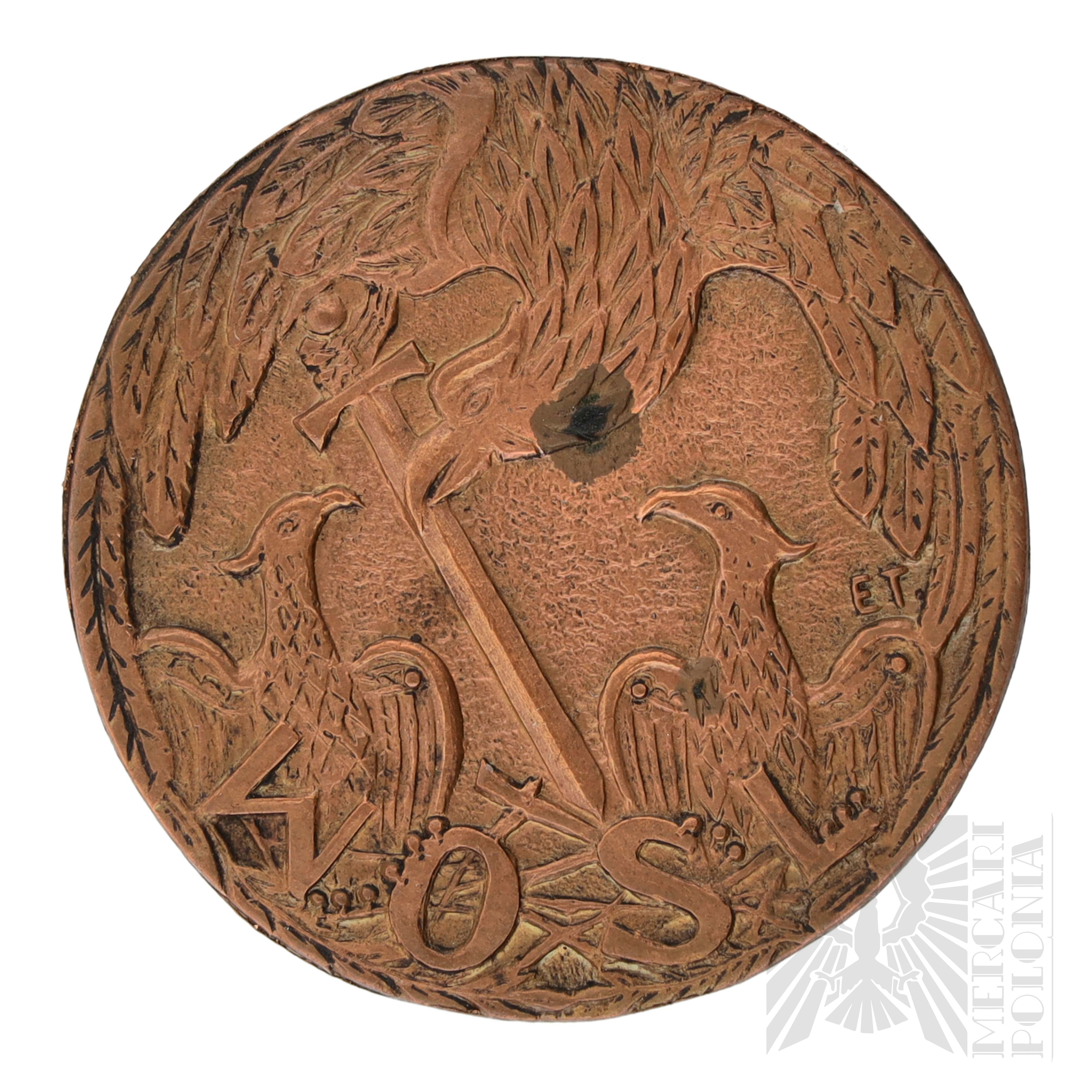 Odznaka jednoczęściowa Wyższej Oficerskiej Szkoły Lotniczej, rewers gładki, pośrodku słupek mocujący. Odznaka sygnowana na awersie inicjałami wykonawcy Emila Trzonkowskiego ET.Średnica : 33 mm