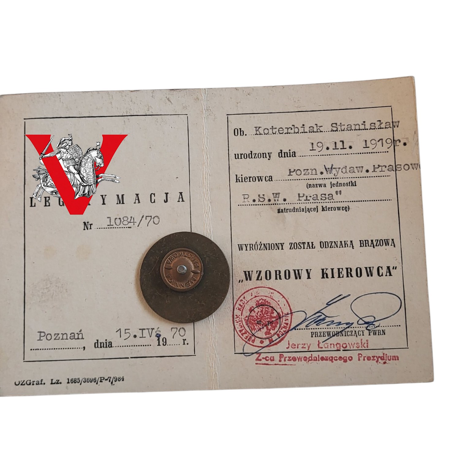 Odznaka Wzorowy Kierowca wraz z Legitymacją , 1970 rok, Poznań