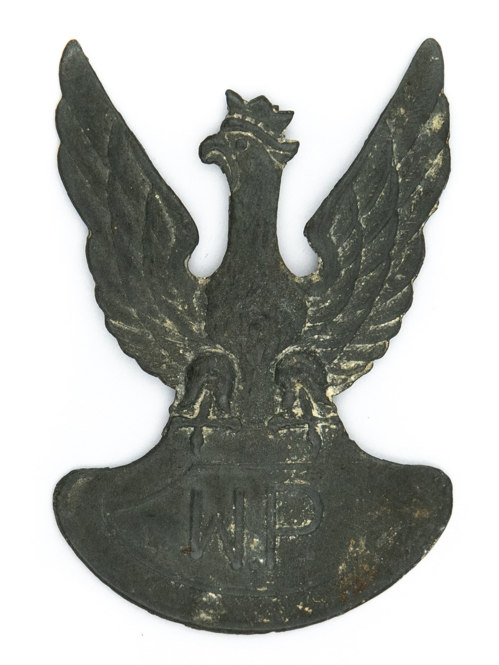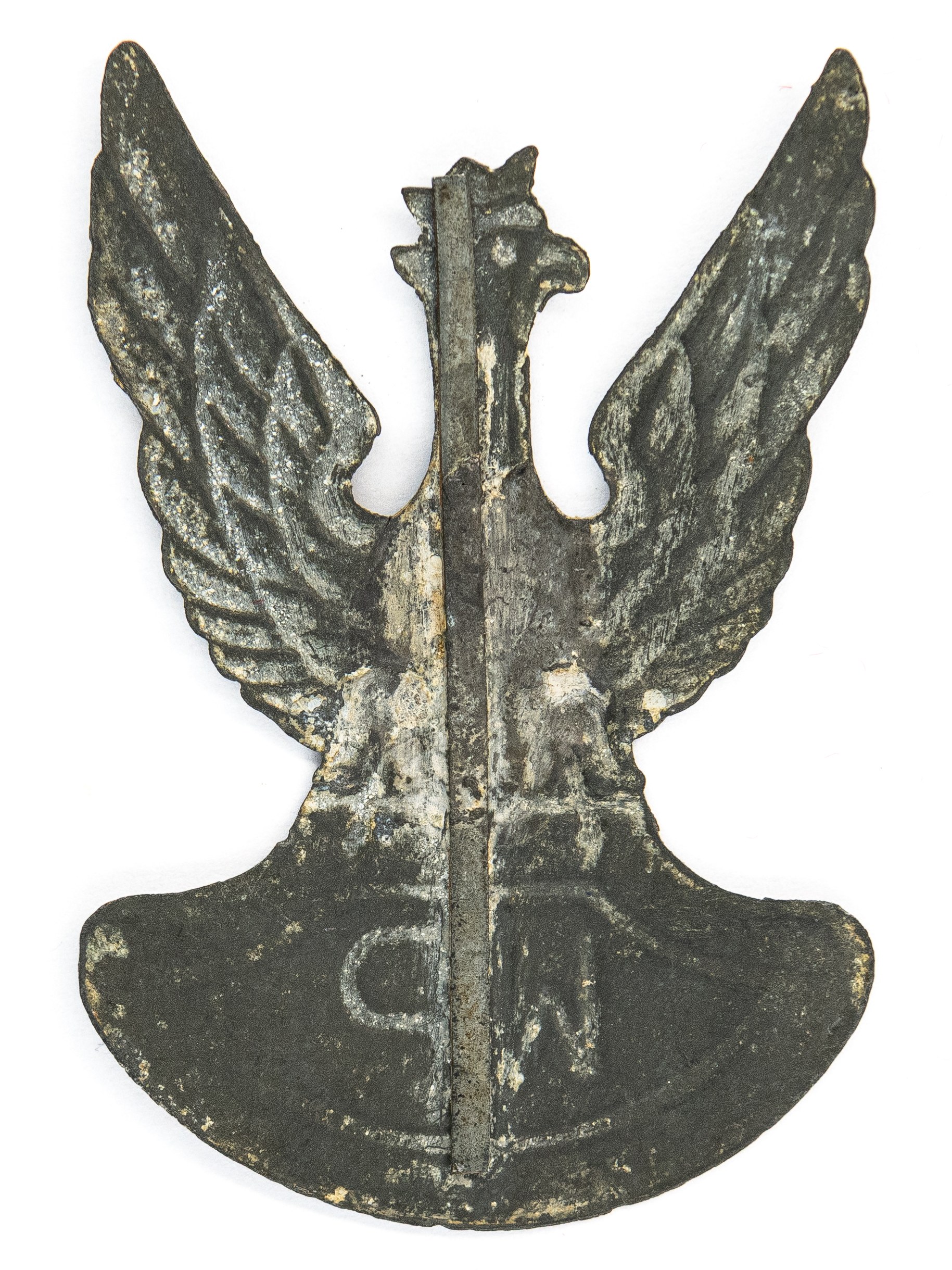 Orzeł partyzancki z literami WP na tarczy. 62 x 42mm. Wykonany z blachy cynkowej. Rewers z kontrą. Mocowany na płaską blaszkę- nierozgięta. Orły te przypisywane oddziałom NSZ. Analogiczny orzeł publikowany jest w książce Tomasza Zawistowskiego, "Polskie orły do czapek w latach 1939-45", str. 189. Stan bardzo dobry- orzeł nigdy nie noszony.