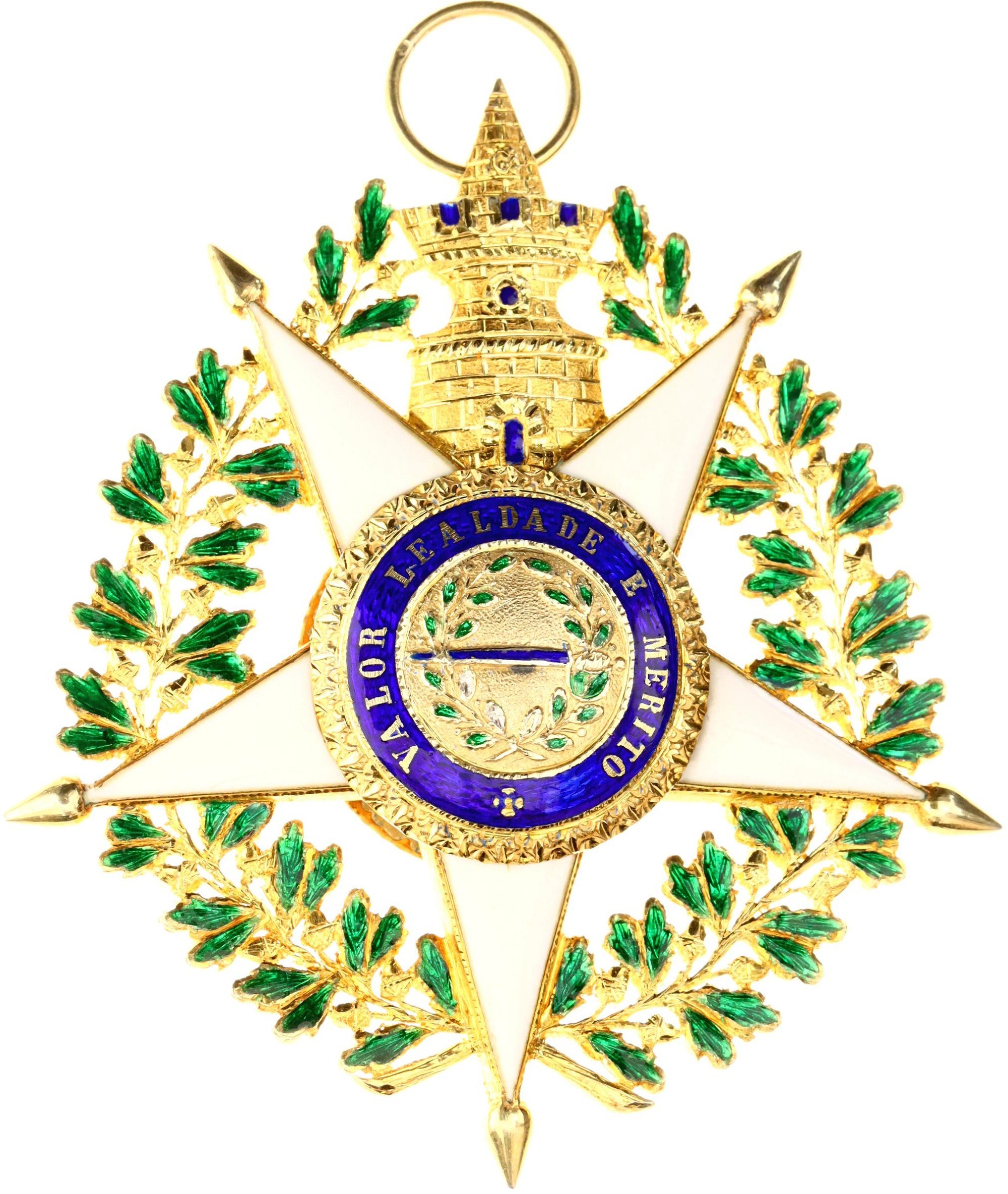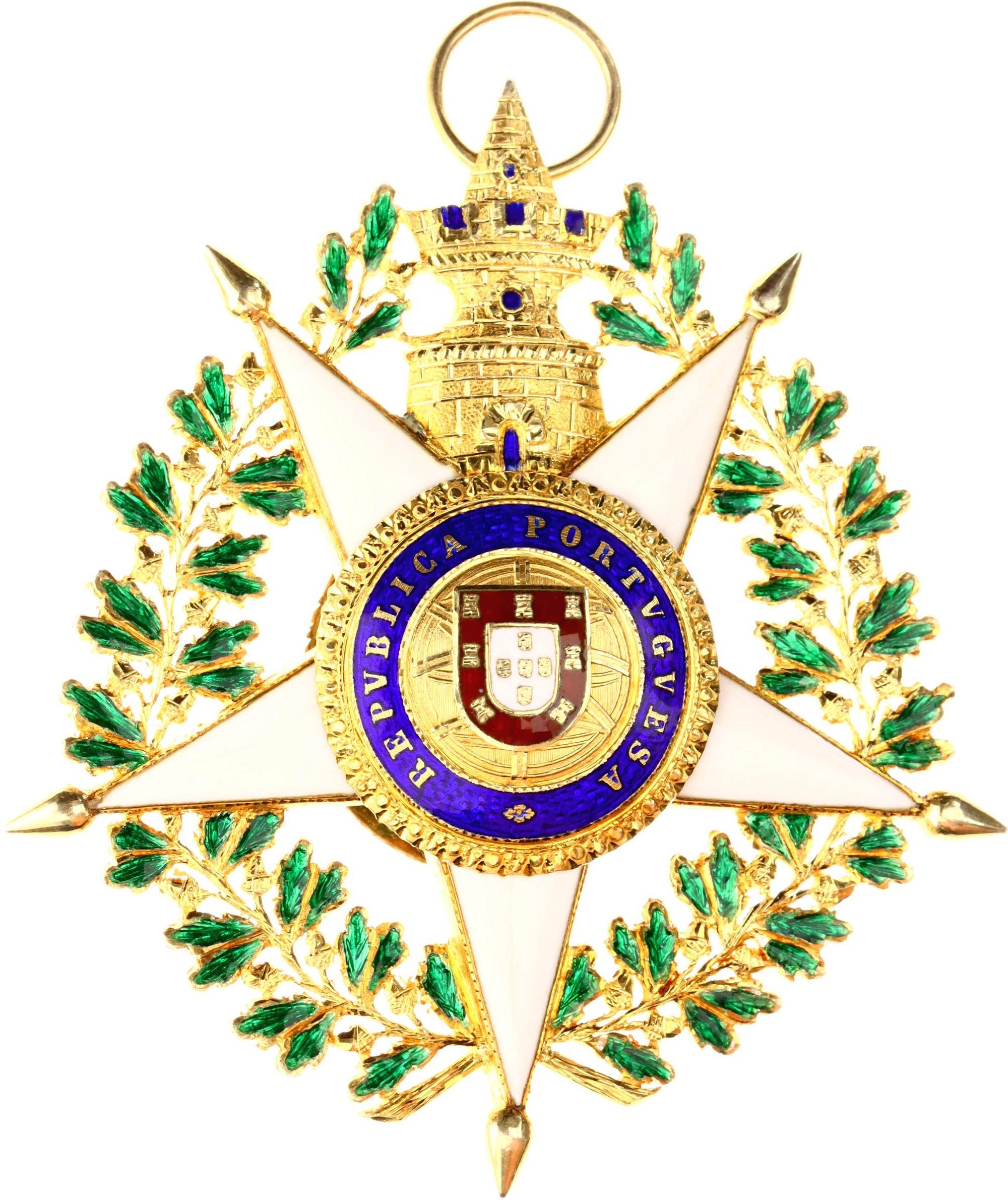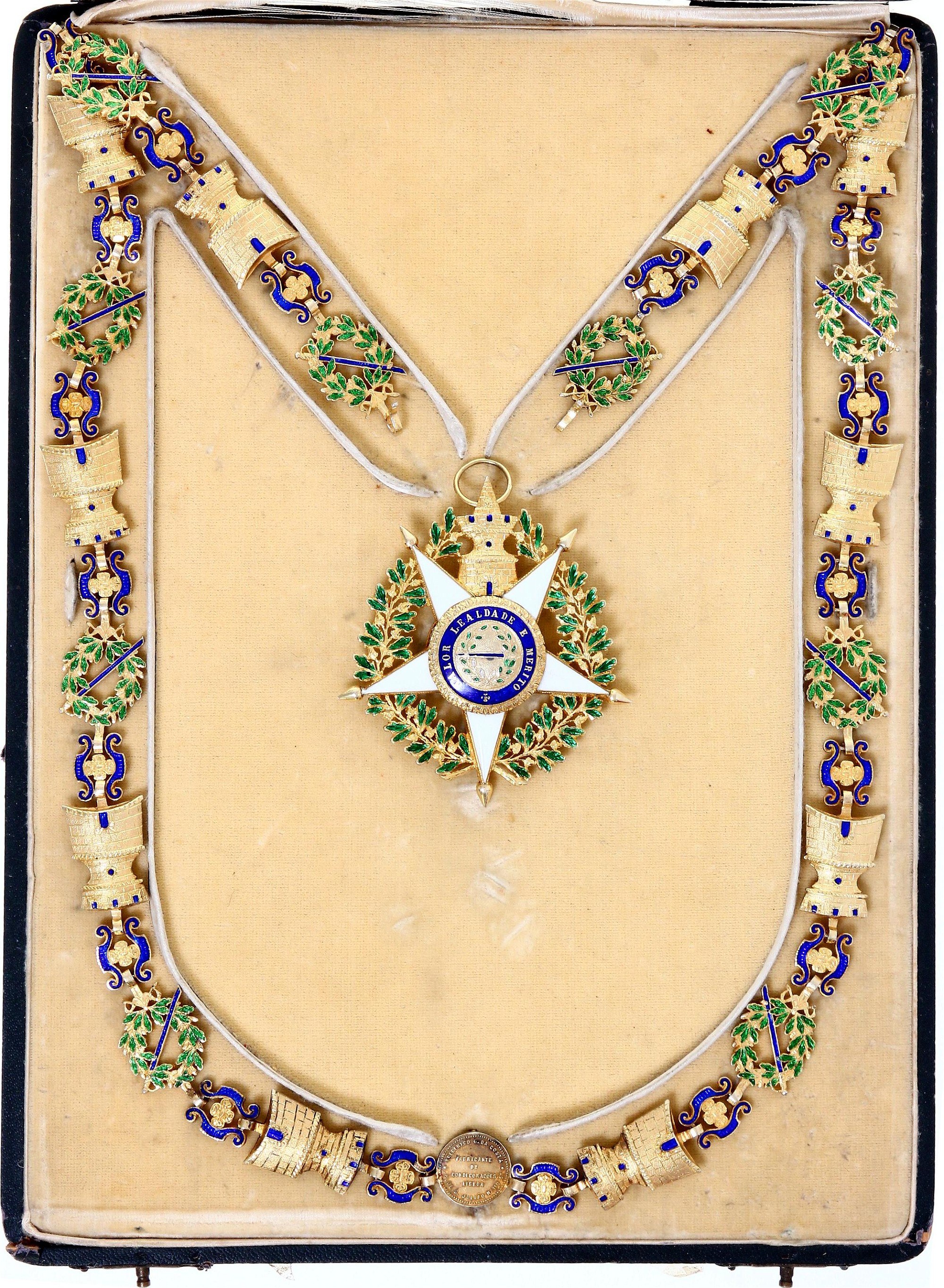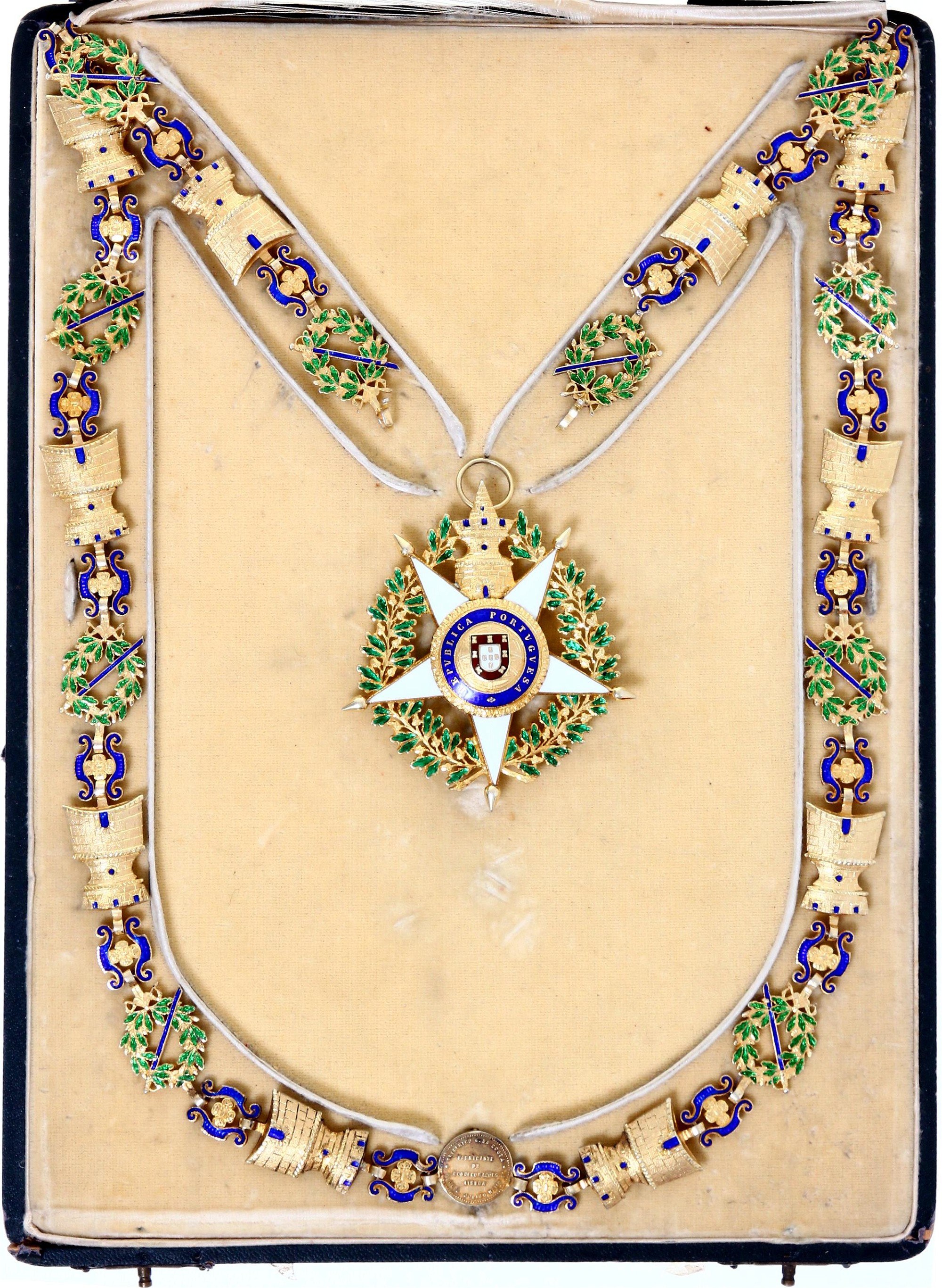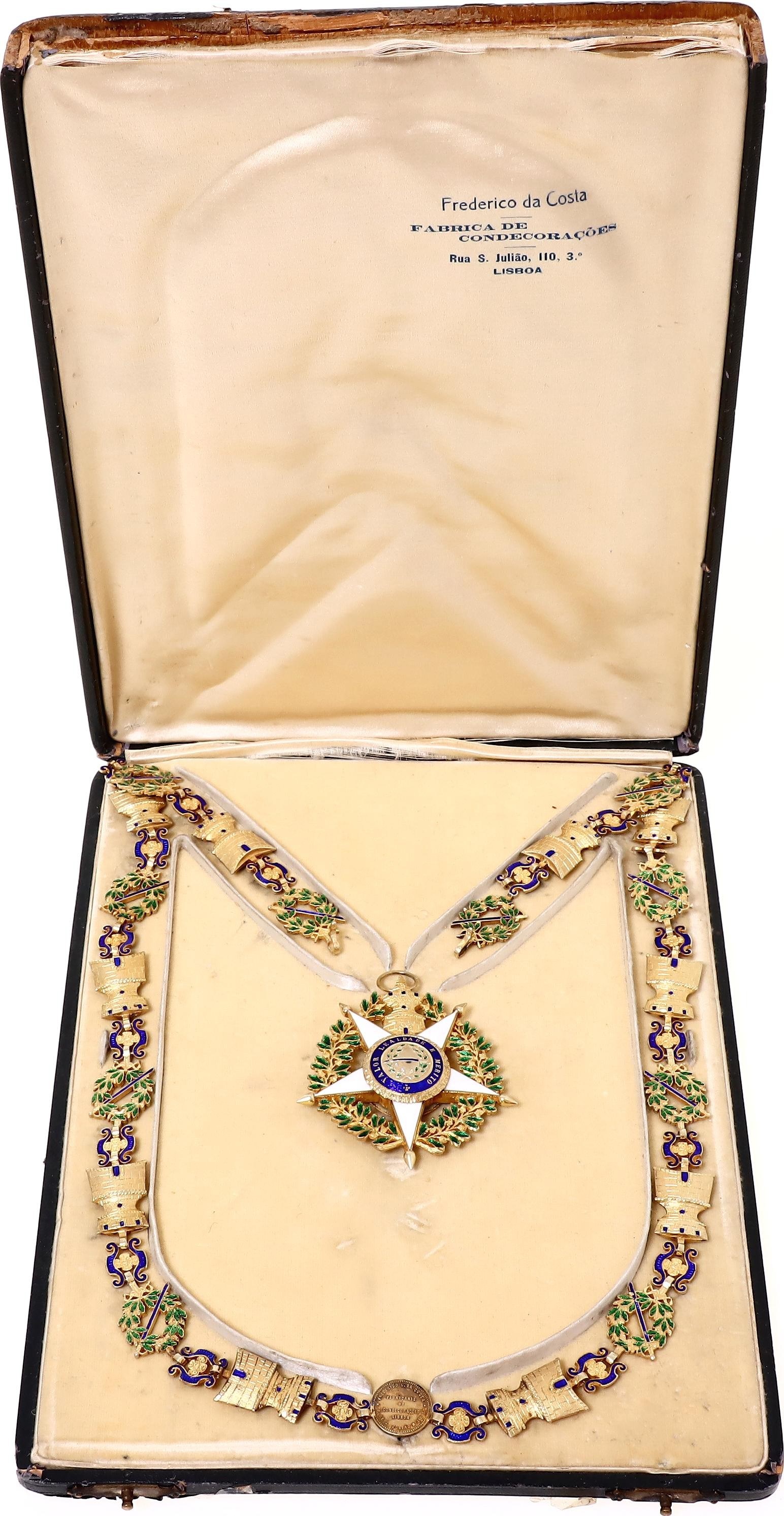Barac# 418-420; Silver; GCC 88.5 cm, 131 g; enameled; with hallmark; GC 75x67 mm.; enameled; in original box (damaged); with docs; manufactured by Frederico da Costa; original name: Ordem Militar da Torre e Espada; This necklace probably belonged to Mr. René Thierry who was already Commander of the Order of Christ of Portugal, in 1928. Early 20th century. ; Condition-I-II