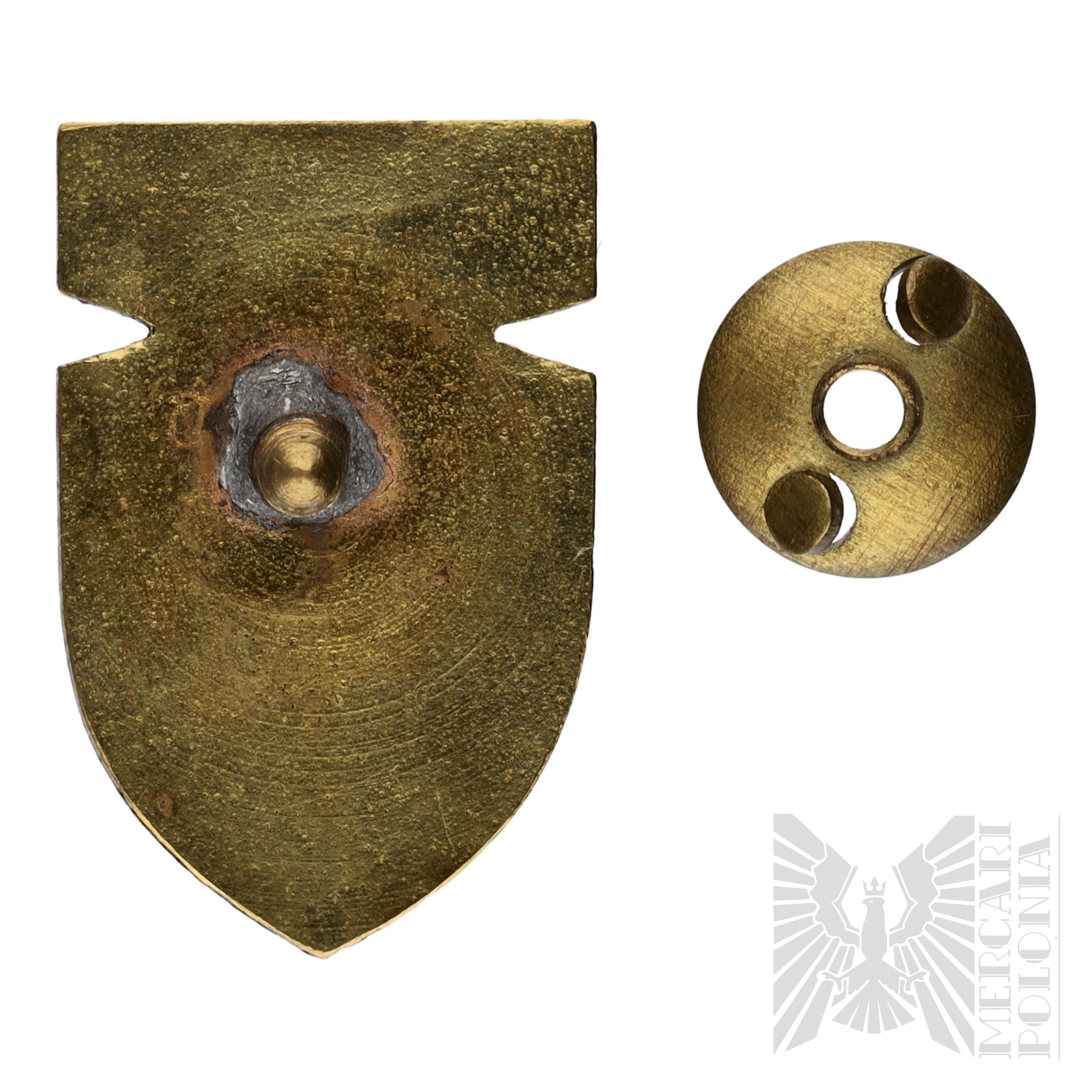 Rewers gładki srebrzony z widocznym słupkiem mocującym i nakrętką.