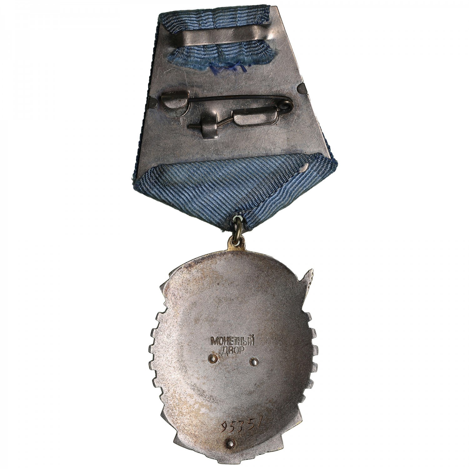 49.38g. Ag 0.925. 47×37 mm. Type 3, Variant 7. Instituted by decree of the Central Executive Committee (CEC) and the Council of People’s Commissars on 7 September 1928; officially approved on 15 December 1928. The statute was amended in 1936, 1943, 1947, and fully revised on 28 March 1980. Awarded for outstanding achievements in labour, production, science, culture, education, public service, and strengthening the defense and economy of the USSR. Recipients included Soviet citizens, enterprises, organizations, cities, and — in exceptional cases — foreign individuals or institutions. The order was worn on the left side of the chest, after the Order of the Red Banner. The decoration consists of a silver gear-shaped badge with a red-enameled banner inscribed “СССР” above a golden wreath of oak leaves encircling industrial motifs — a dam, railway, and river — overlaid with a gilt hammer and sickle. Around the gear rim runs the motto “Пролетарии всех стран, соединяйтесь!” (Proletarians of all countries, unite!). Below is a red-enameled five-pointed star. The ribbon is dark blue with narrow blue edge stripes. Designed by V. Kupriyanov (1928 type) and later revised by V. Golenecki (1935 type). The first Order No. 1 was awarded to the Krasny Putilovets (Kirov) Plant in Leningrad. Early personal recipients included aviation mechanics Fedotov, Shelagin, and Kvyatkovsky for their participation in the 1928 rescue of the Italia airship expedition. Before World War II more than 8,000 awards were made; during the war — about 21,500 to industrial and civilian workers. By 1991, over 1.2 million decorations had been issued, making it one of the most widely awarded Soviet orders for labour merit.