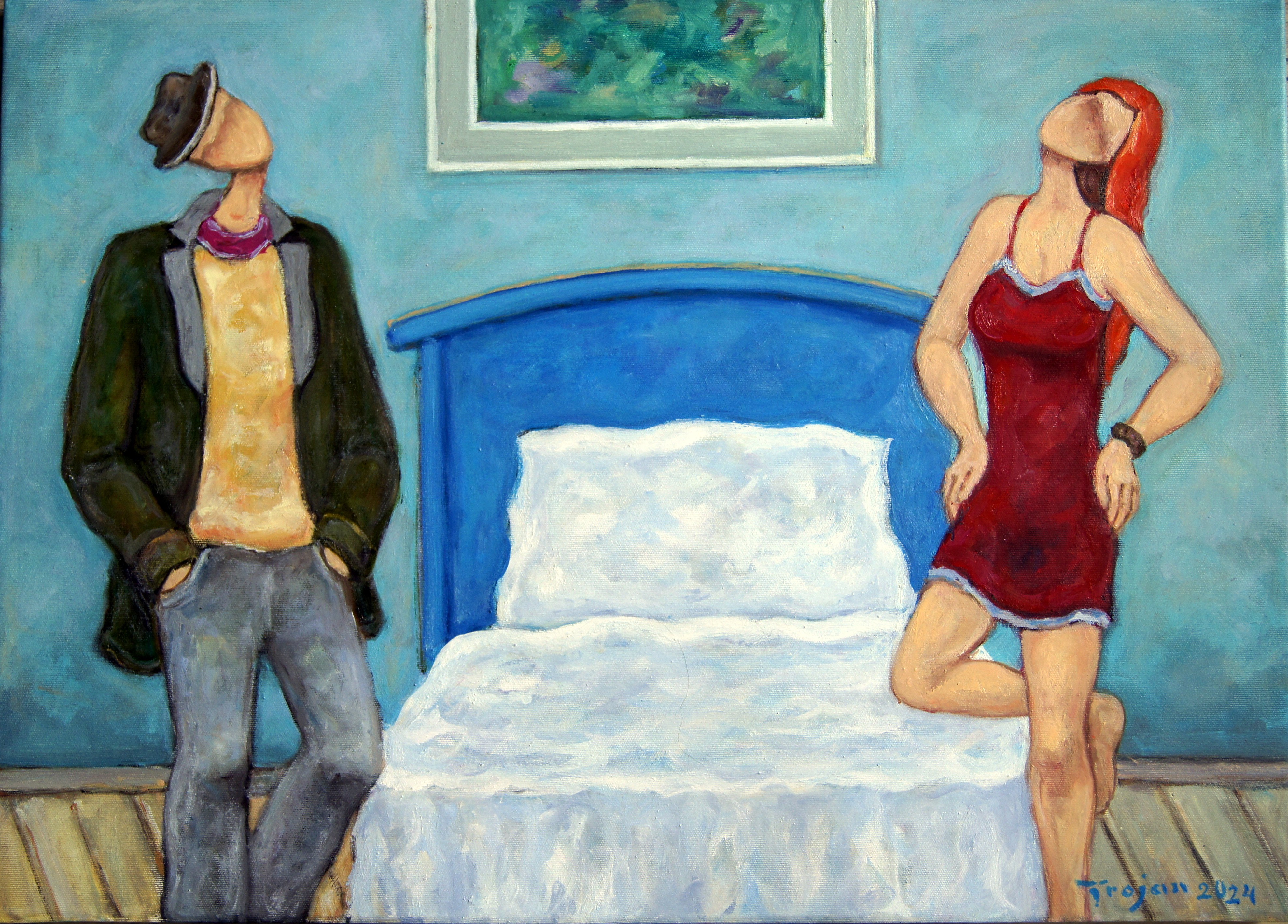 Henryk Trojan - urodził się w 1954 roku w Piotrkowie Trybunalskim. Jest absolwentem PWSSP w Łodzi (obecnie Akademia Sztuk Pięknych). Malarstwo studiował w pracowni prof. Wiesława Garbolińskiego. Na studiach, które skończył w 1987 roku przekonał się, że najlepiej czuje się malując farbami olejnymi i tej technice pozostał wierny do dziś. Artysta bardzo wnikliwie obserwuje najbliższe mu otoczenie, rzeczywistość łączy ze swoją wyobraźnią. Jego malarstwo figuratywne cechują postacie o nienaturalnie wydłużonych kończynach. Przedstawieni ludzie umiejscowieni są na tle codziennych scenerii, w parku, na ławce, czy w kawiarni. Melancholii i tajemniczości dodaje brak twarzy u postaci. Najważniejsze są gesty, na których ma skupić się widz. Przytulny klimat pełen troski i czułości nadają ziemiste, trochę przygaszone barwy. Malarz brał udział w wielu międzynarodowych wystawach, na których dostał wiele nagród i wyróżnień. Nagrodzony był na ogólnopolskim konkursie malarstwa „Bielska Jesień 95”.