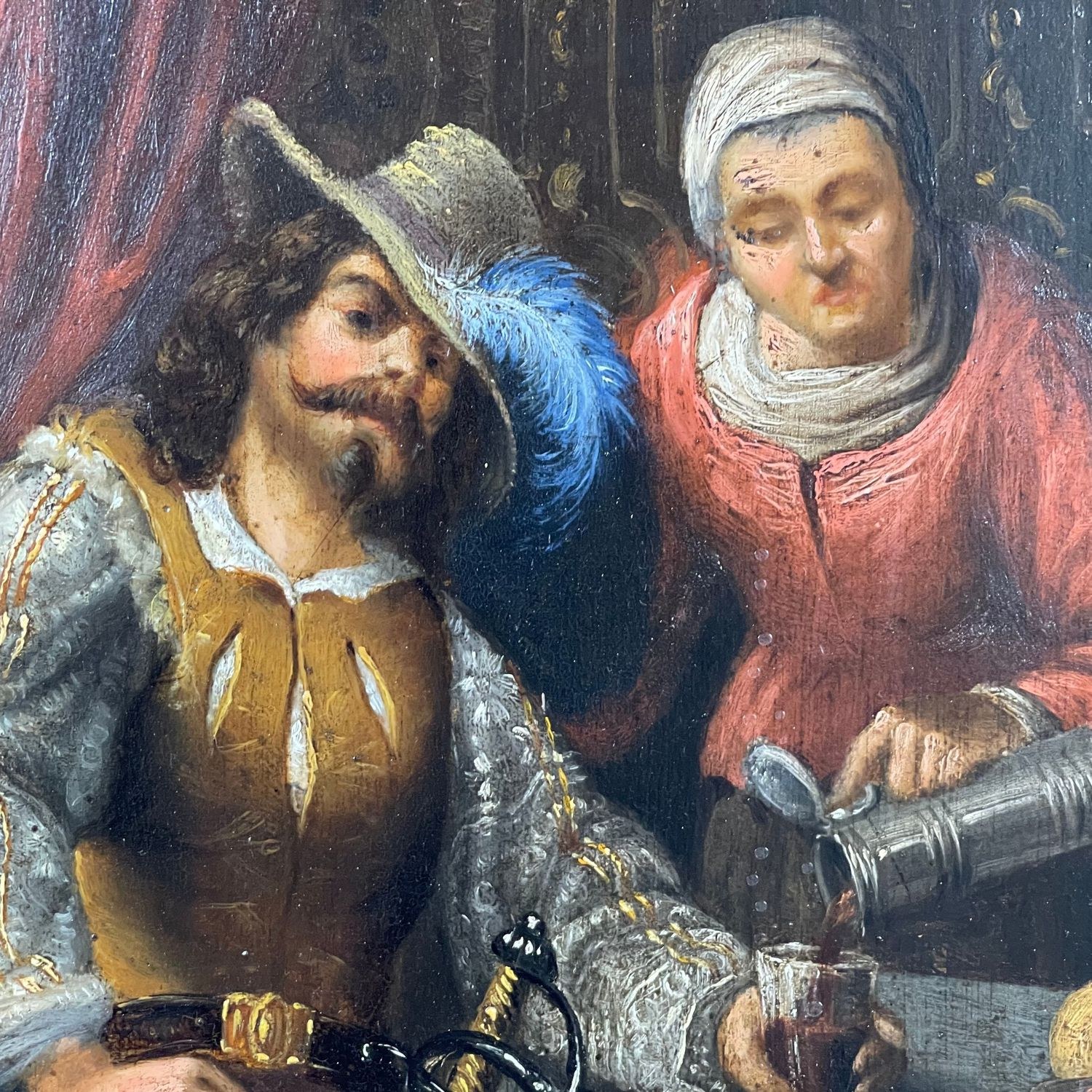 Oil on panel, Spanish school, 19th century, depicting a scene of characters in an inn.