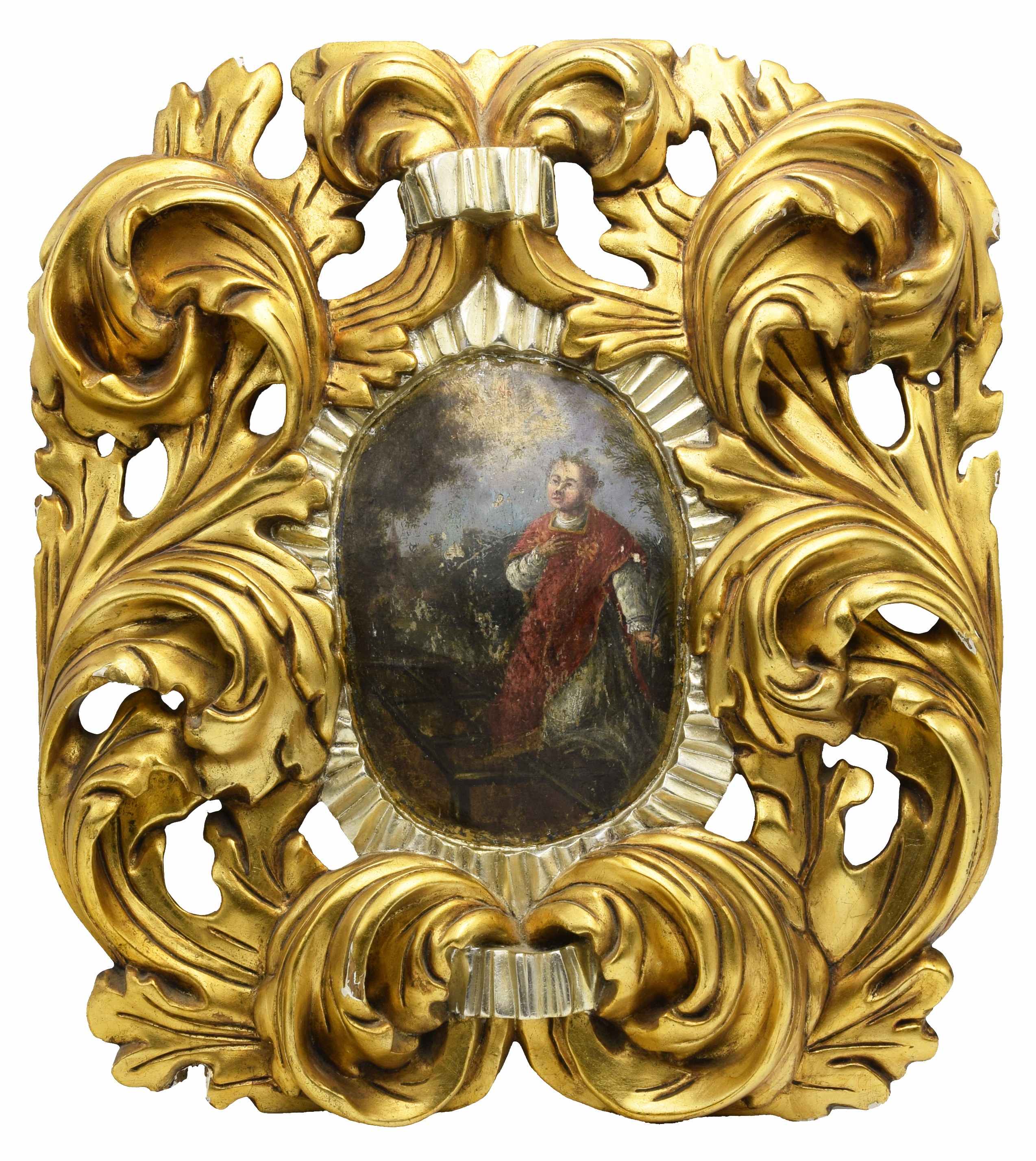 olej, drewno, rama bogato rzeźbiona w motywy liści akantu, stanowiąca całość z obrazem; 51 x 47 cm z ramą;