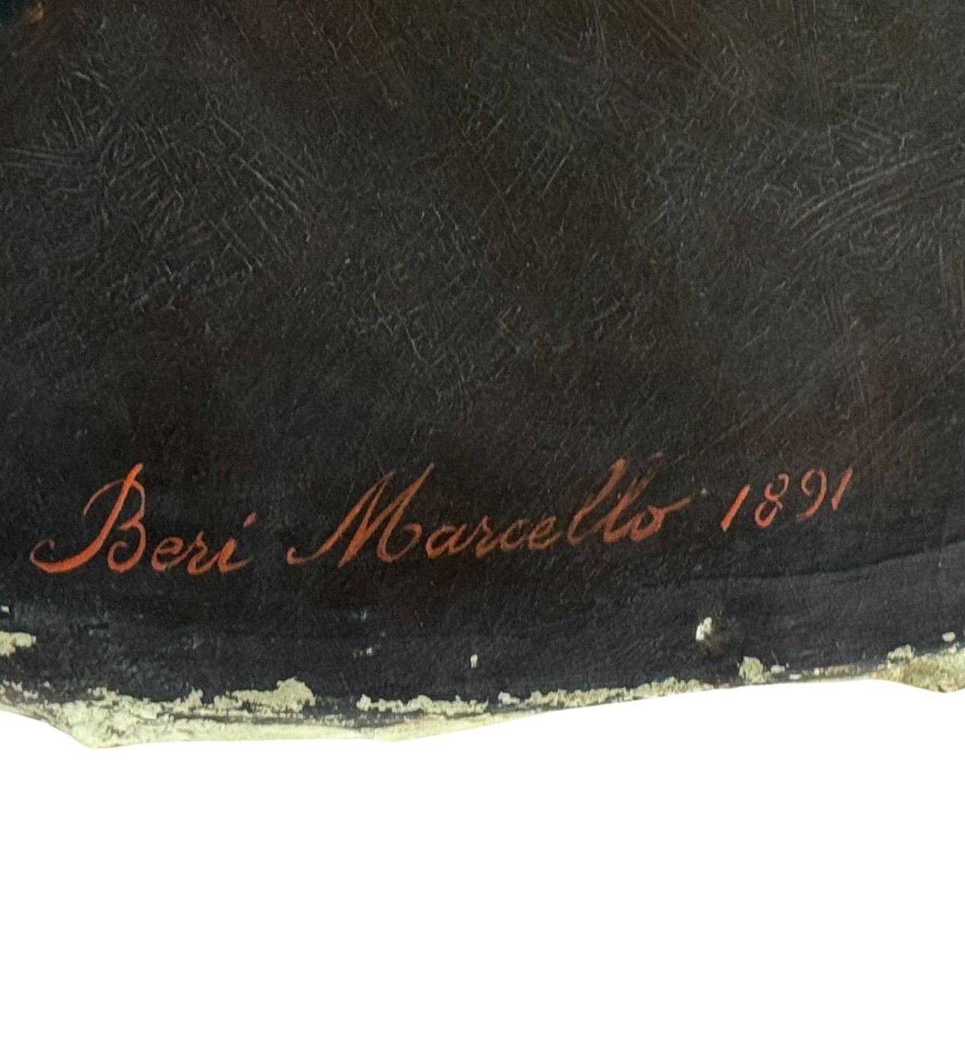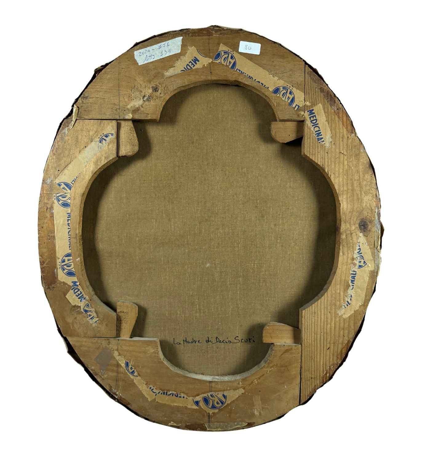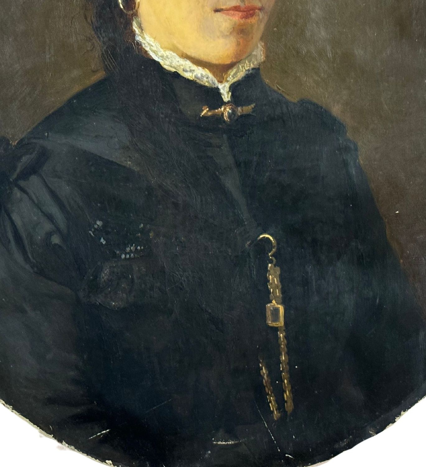 Oil painting on oval canvas, 19th-century Italian school, depicting a Portrait of a Woman (The Mother of Decio Scuri). Dimensions: 72x62 cm. Signed on the right side by Beri Marcello. The artwork is in good condition, with slight signs of wear as shown in the attached photos.