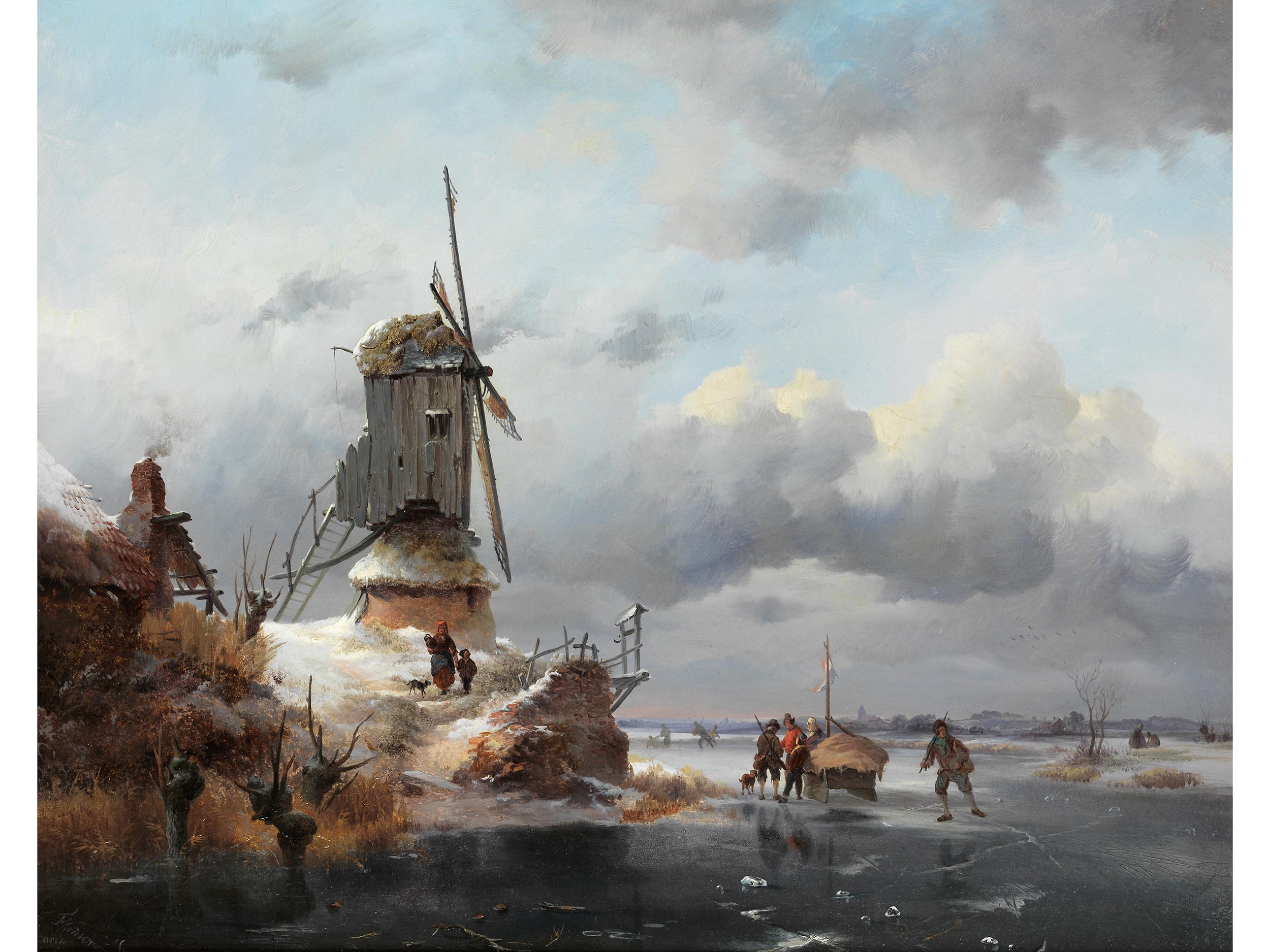 Blick auf eine weite winterliche Landschaft mit vereistem Flusslauf, auf dem sich mehrere Personen befinden, darunter ein beladener Schlitten. Links am Uferrand, auf einer kleinen Anhöhe, eine alte Windmühle, daneben ein halb zerfallenes Gehöft. Stimmungsvolle Malerei unter hohem Horizont, der fast drei Viertel des Gemäldes einnimmt, mit tief hängenden, zum Teil sonnenbeschienenen Wolken. Typisches Werk für den bekannten Künstler. (1411433) (1) (18)