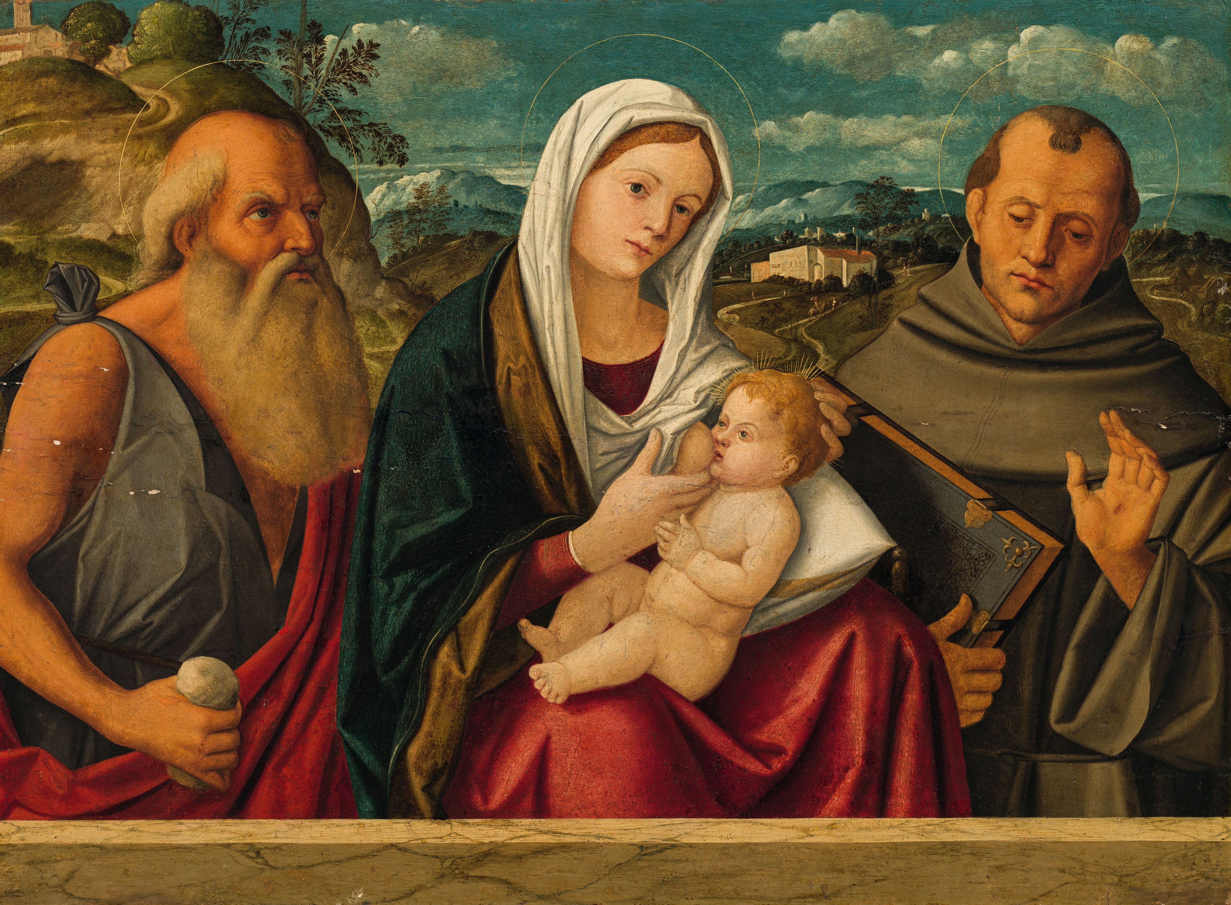 On the left side of the painting, St Jerome stands clad as a hermit, his right hand firmly clasping a stone, the attribute with which he, as a penitent, is prepared to beat his chest. On the other side of the Madonna is Saint Francis, wearing a grey-brown habit with tonsure and holding the book referring to the foundation of the order in his arms. He holds up his left hand, the visible stigma on his palm pointing towards the young Jesus, whom he looks to with a serious, almost worried expression: a foreshadowing of the coming Passion of Christ. Next to him, the Madonna's unfocussed gaze into the distance can be interpreted as an expression of acceptance of her son's inevitable fate. Thus, on closer inspection, what appears to be a simple composition really contains a wealth of symbolism – a "sacred dialogue", not so much between the depicted figures, as with the viewer themselves.
