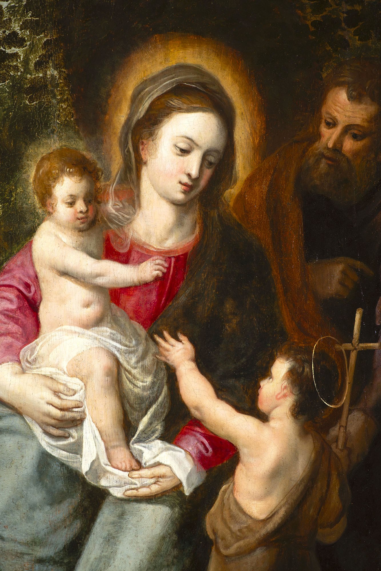 Mary is seated within a landscape positioned in front of a tree, holding the infant Jesus on her lap. She leans towards the kneeling figure of the young John, who extends his hand towards Jesus The infant Jesus, while supported by Mary, also reaches out towards John. St. Joseph observes the scene from the right This meeting of Jesus and John as children foreshadows their future encounter at Jesus' baptism in the Jordan River by John the Baptist. A basket overflowing with roses rests on the ground, with a backdrop revealing a clearing within a forest.