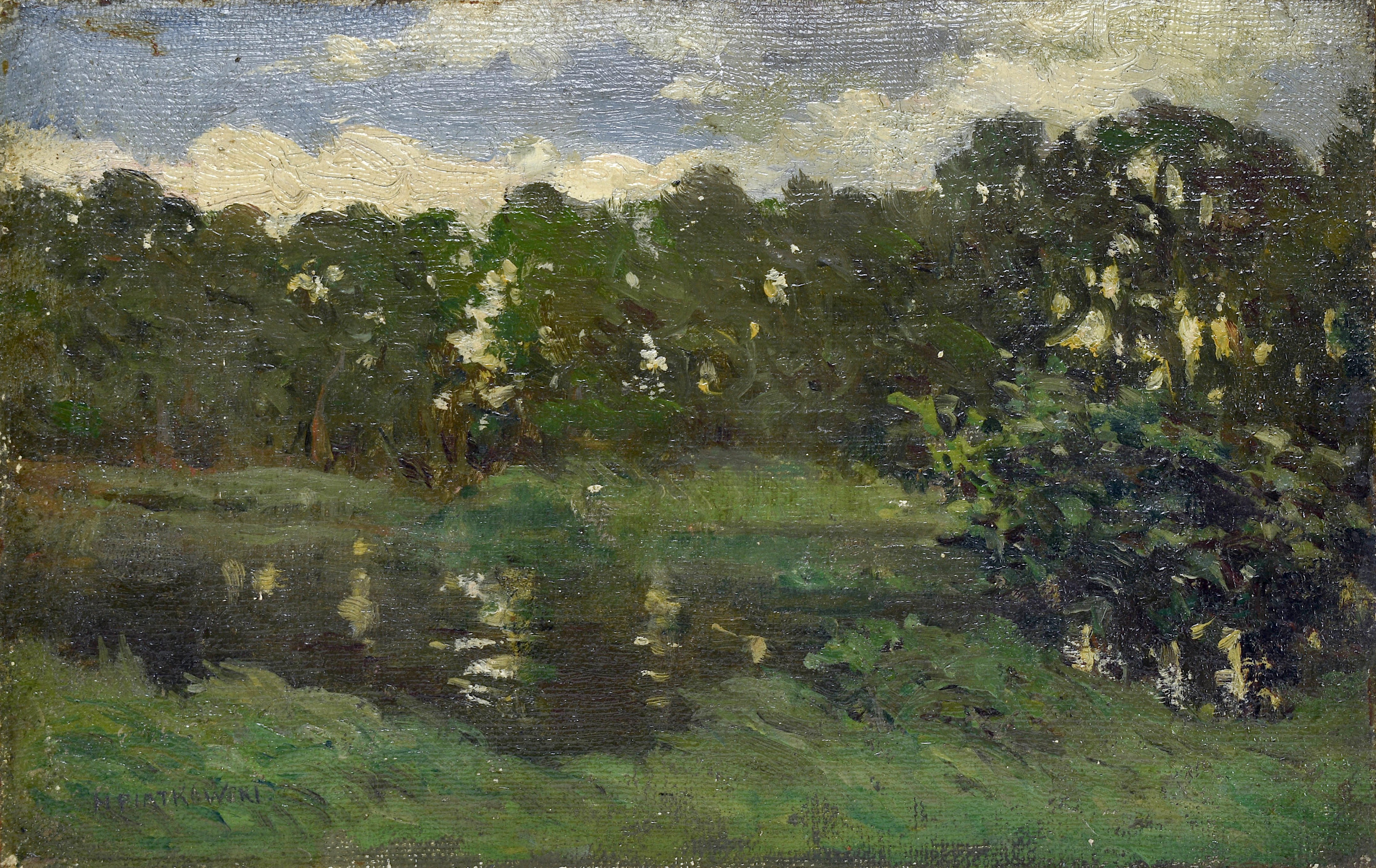 Na odwrocie nalepka wystawowa z 1923 r. z nr 496, z tytułem obrazu: Pejzaż letni.