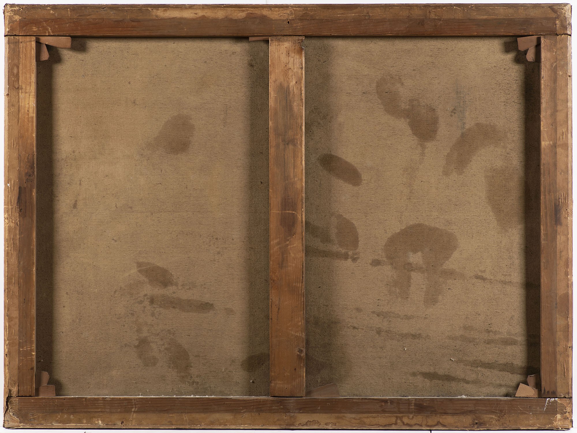 This canvas represents a biblical episode taken from the Old Testament book of Tobias, in which it is told how Tobiolo, returning from a long initiatory journey accompanied by the angel Raphael and a dog, restored sight to his blind father. In the scene, the figure of the old father sits on a bench with his eyes closed, attended by the young Tobiolo and the angel (on the left), whose open wings can be glimpsed. The scene is built around the gestural dynamic of healing: Tobias points to his father with one hand and holds the bowl with which he will anoint his father's eyes with the gall of the fish he caught during the journey. The chromatic vivacity and movement of the bodies, intertwined, superimposed and interacting, create dynamism; and at the same time, an almost unicum standout in this work., Oil on canvas, 86 x 116 cm
