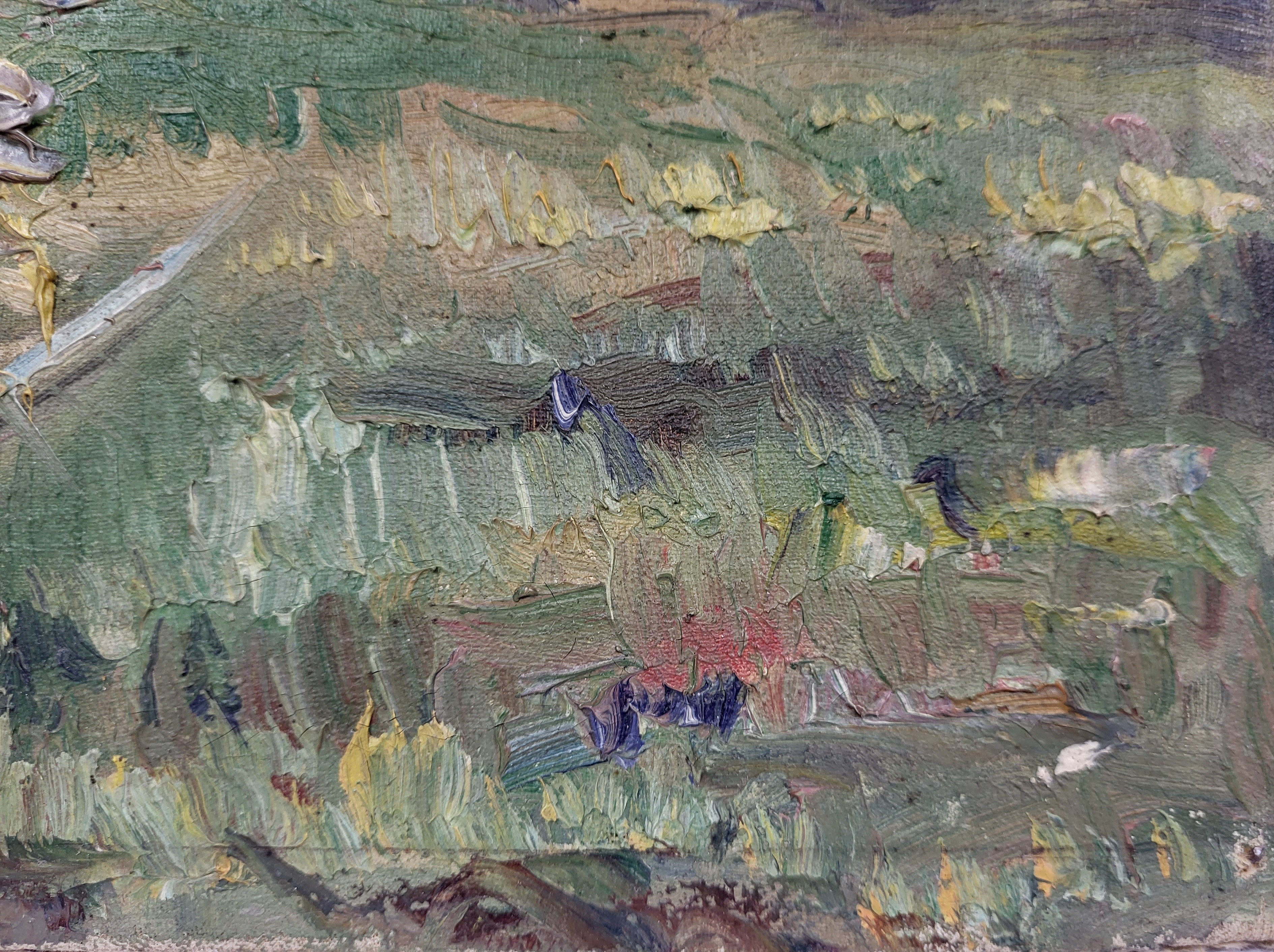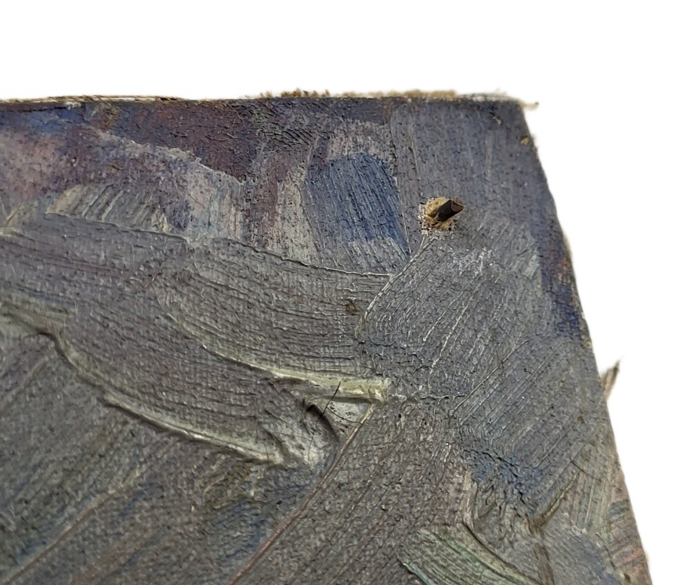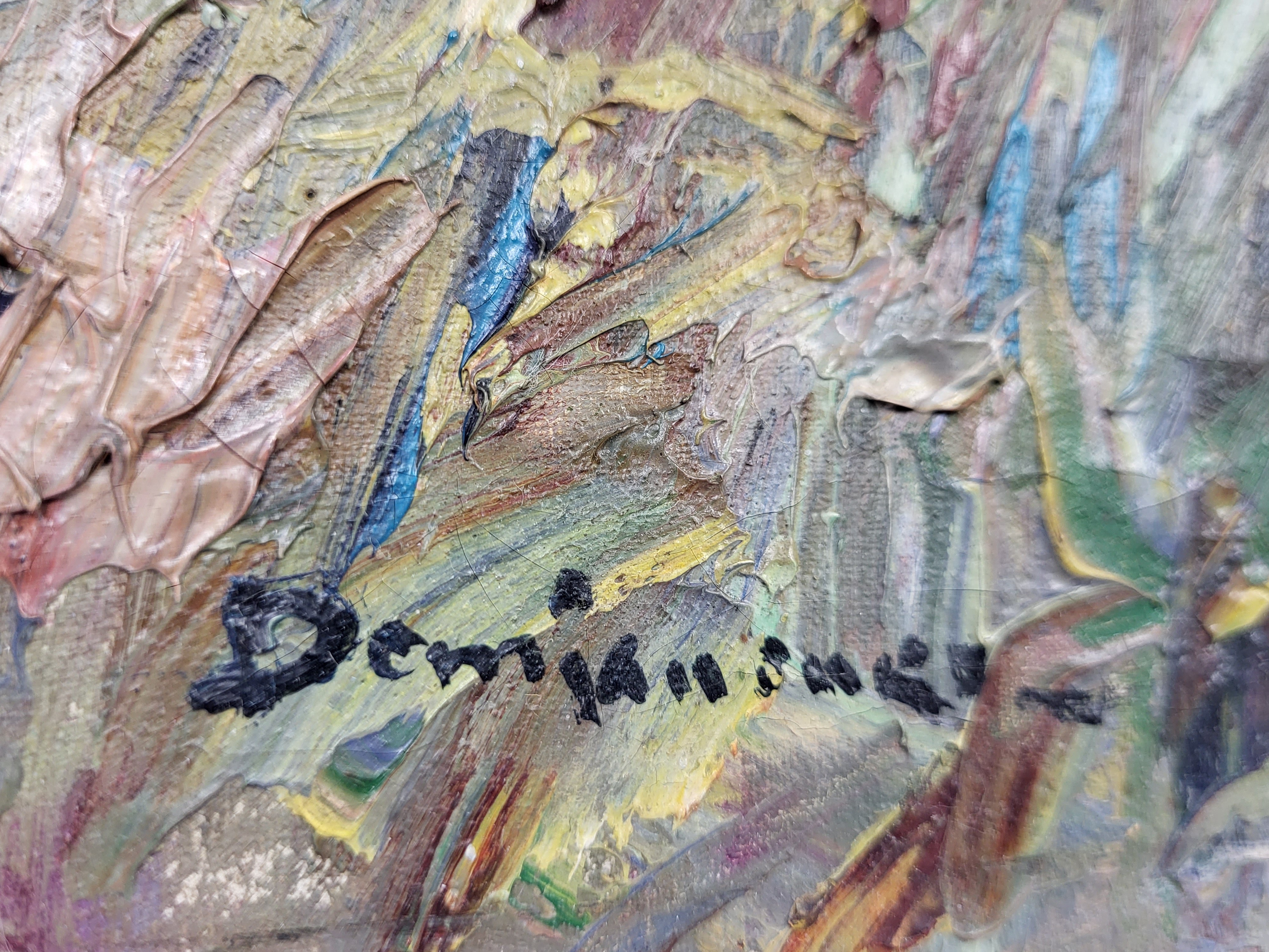 stan: sygnowany Demianienko (?), brak ramy, w prawym, górnym i prawym dolnym rogu gwoździe przebite przez płótno