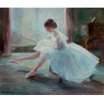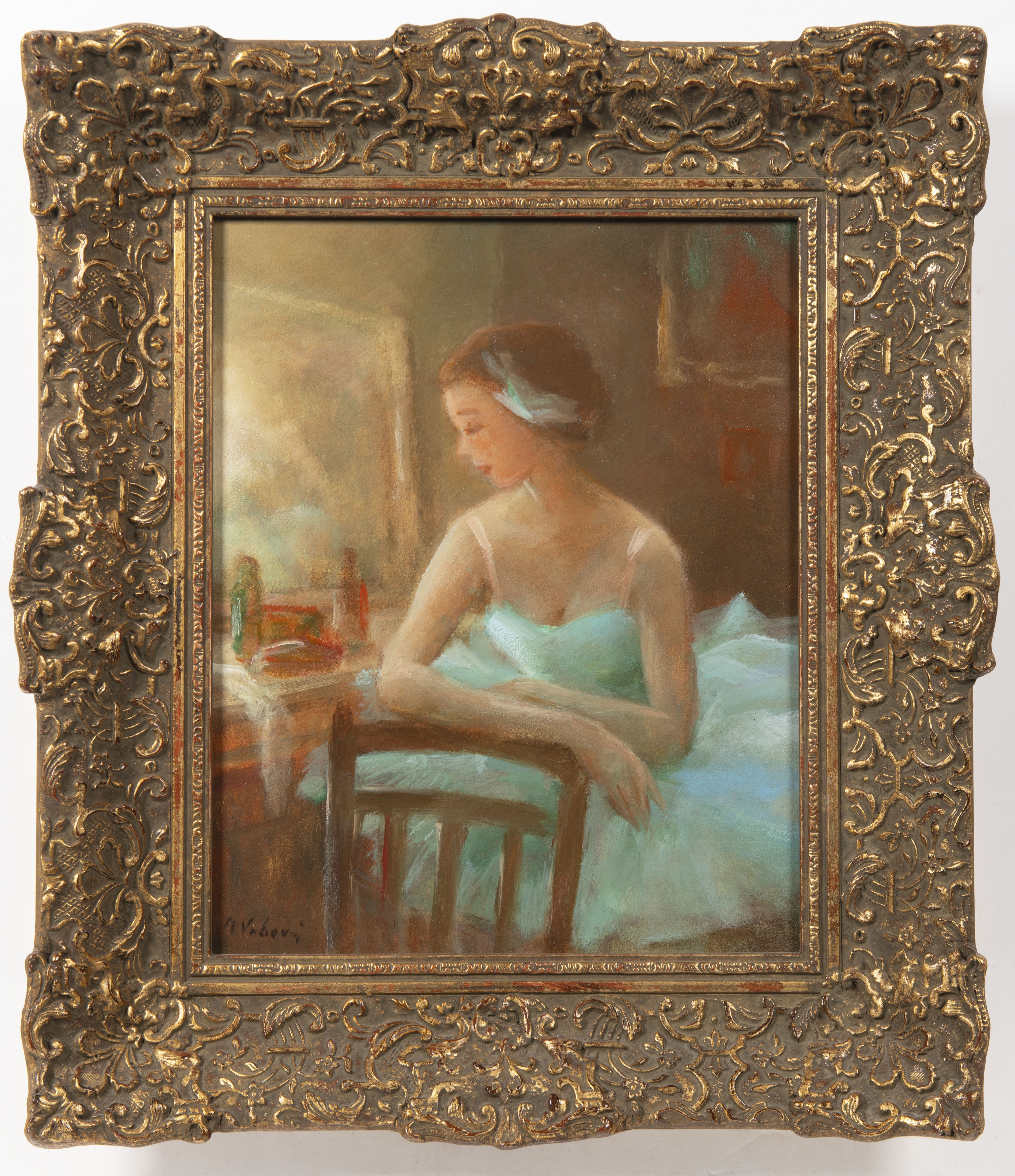 Seated ballerina in front of the make-up mirror. Oil on cardboard, left bottom signed , 29 x 23 cm