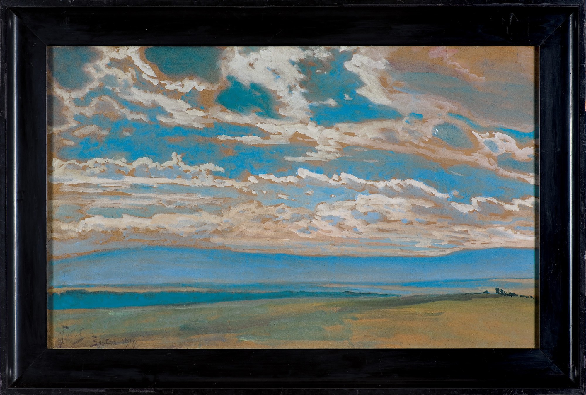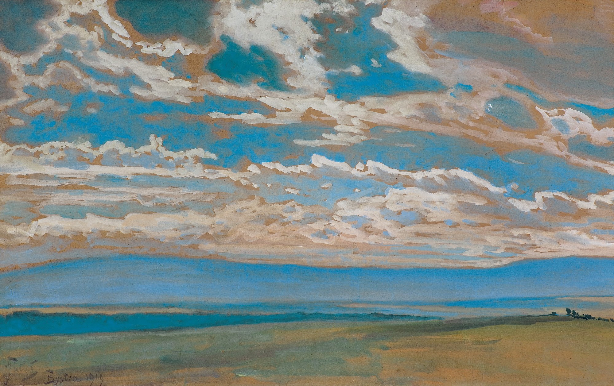 Rok 1919 to czas szczególny – Fałat, już po zakończeniu wojny i odzyskaniu przez Polskę niepodległości, malował z nową energią, a jego pejzaże zyskiwały wymiar kontemplacji i zadumy. Powstałe w Bystrej dzieło emanuje lekkością i świeżością, stanowiąc znakomitą syntezę dojrzałego stylu artysty. Fałat uwypuklił chmury, które dominują w prezentowanym pejzażu, pomijając jednocześnie nieistotne szczegóły. Widok nasycony spokojem, ciszą i pozbawiony obecności człowieka, odsłania transcendentny wymiar Natury. Malując fragment krajobrazu Fałat stworzy pejzaż uniwersalny, ponadczasowy, przepełniony poetyckim odczuwaniem światła.